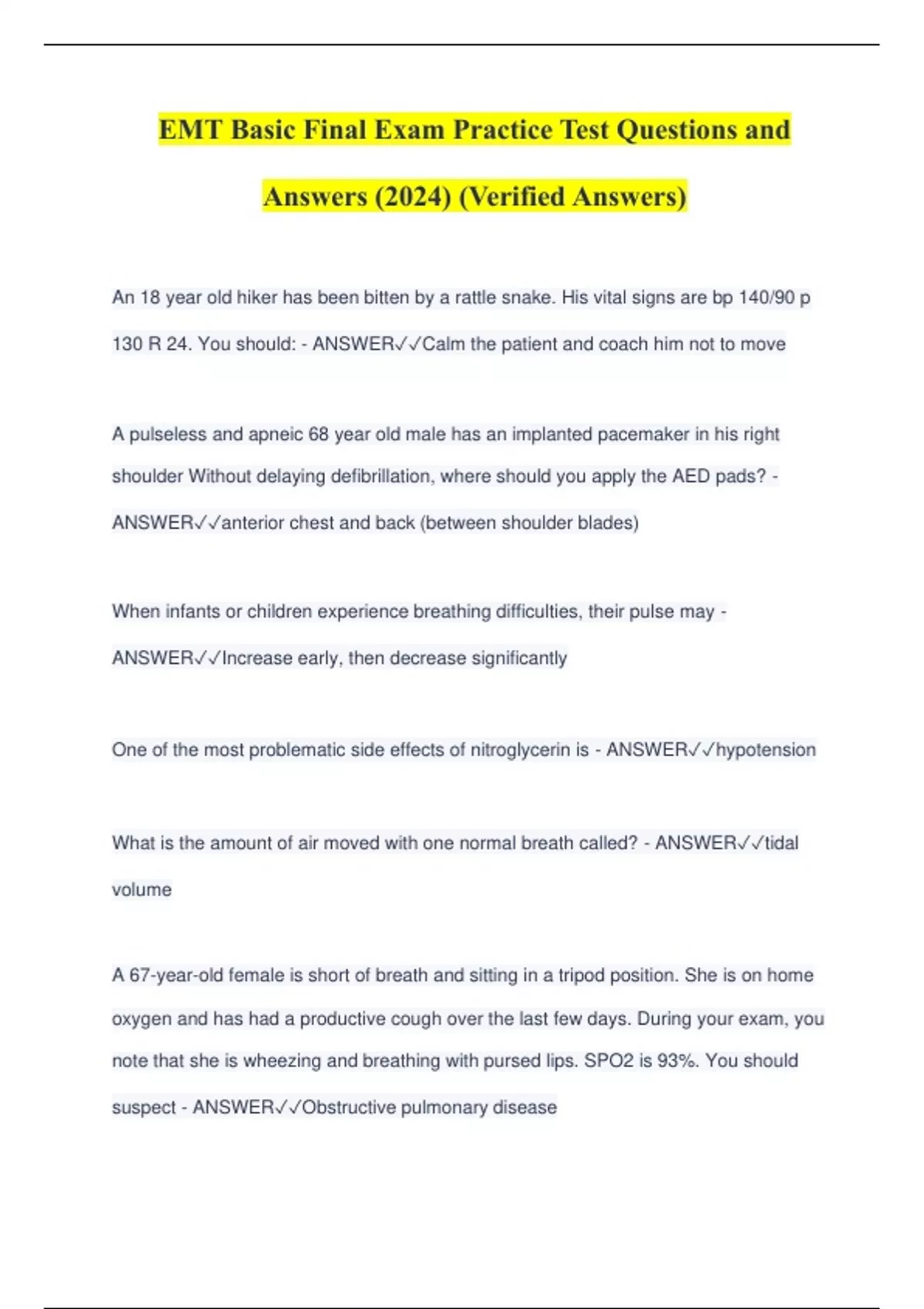 EMT Basic Final Exam Practice Test Questions and Answers (2024) (Verified Answers) An 18 year old hiker has been bitten by a rattle snake. His vital signs are bp 140/90 p 130 R 24. You should: - ANSWERCalm the patient and coach him not to move A pulseless and apneic 68 year old male has an implanted pacemaker in his right shoulder Without delaying defibrillation, where should you apply the AED pads? - ANSWERanterior chest and back (between shoulder blades) When infants or children experience breathing difficulties, their pulse may - ANSWERIncrease early, then decrease significantly One of the most problematic side effects of nitroglycerin is - ANSWERhypotension What is the amount of air moved with one normal breath called? - ANSWERtidal volume A 67-year-old female is short of breath and sitting in a tripod position. She is on home oxygen and has had a productive cough over the last few days. During your exam, you note that she is wheezing and breathing with pursed lips. SPO2 is 93%. You should suspect - ANSWERObstructive pulmonary disease A 2-year-old boy has a circumferential burn to his hand up to the wrist. The mother tells you a pot of boiling water spilled onto the boy. You should - ANSWERTransport and inform the ER that you suspect abuse What does pulse oximetry measure? - ANSWERThe amount of hemoglobin that is saturated usually with oxygen You respond to a scene where a mentally ill adult is threatening to kill himself. He is refusing transportation to a hospital. You should - ANSWERask law enforcement for assistance A 23 y/o construction worker twisted his foot climbing up a la