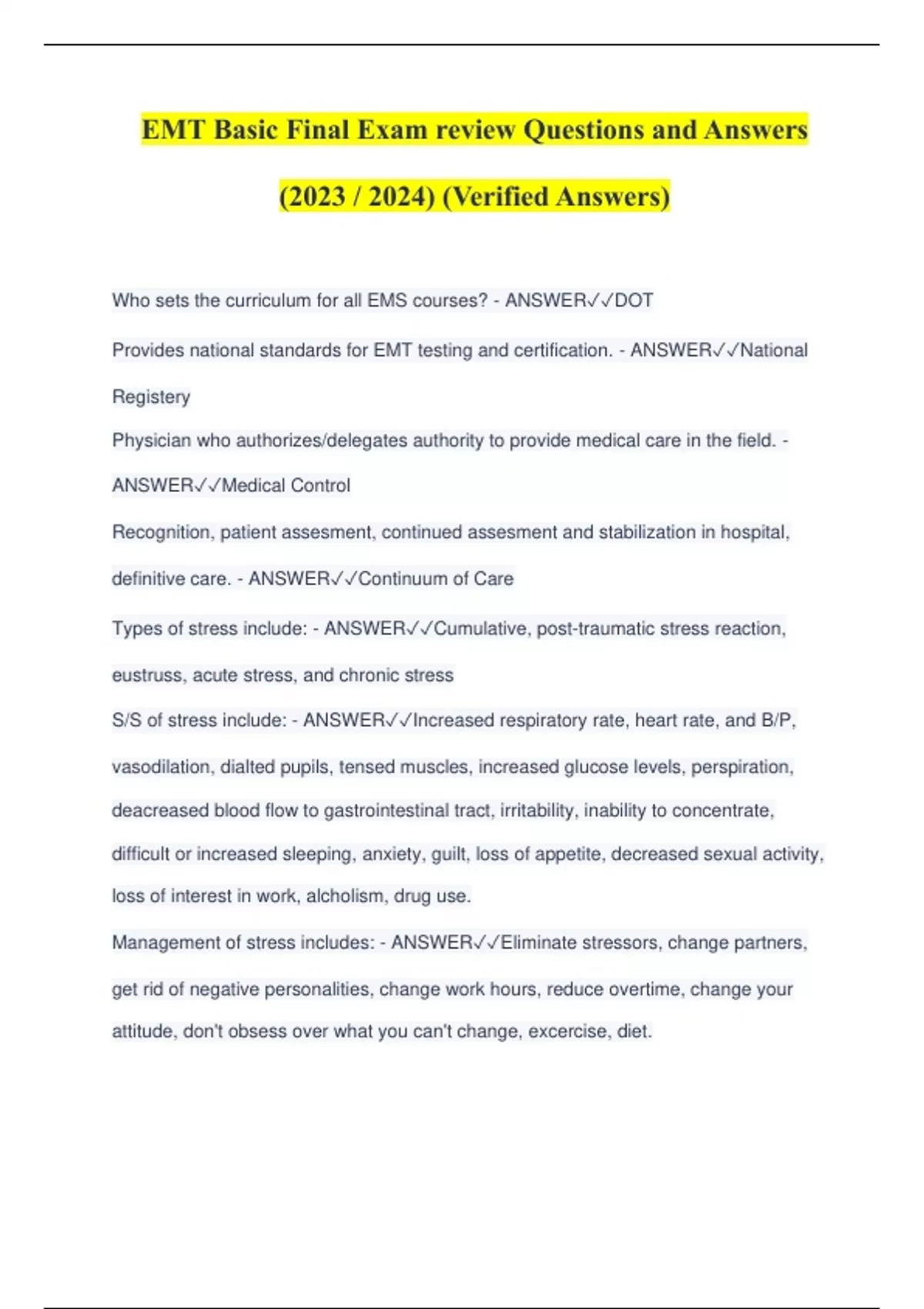 EMT Basic Final Exam review Questions and Answers (2023 / 2024) (Verified Answers) Who sets the curriculum for all EMS courses? - ANSWERDOT Provides national standards for EMT testing and certification. - ANSWERNational Registery Physician who authorizes/delegates authority to provide medical care in the field. - ANSWERMedical Control Recognition, patient assesment, continued assesment and stabilization in hospital, definitive care. - ANSWERContinuum of Care Types of stress include: - ANSWERCumulative, post-traumatic stress reaction, eustruss, acute stress, and chronic stress S/S of stress include: - ANSWERIncreased respiratory rate, heart rate, and B/P, vasodilation, dialted pupils, tensed muscles, increased glucose levels, perspiration, deacreased blood flow to gastrointestinal tract, irritability, inability to concentrate, difficult or increased sleeping, anxiety, guilt, loss of appetite, decreased sexual activity, loss of interest in work, alcholism, drug use. Management of stress includes: - ANSWEREliminate stressors, change partners, get rid of negative personalities, change work hours, reduce overtime, change your attitude, don't obsess over what you can't cha