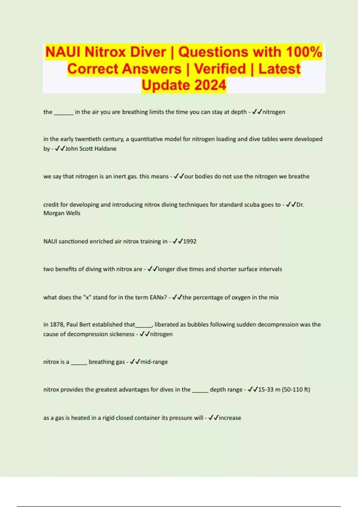 NAUI Nitrox Diver | Questions with 100% Correct Answers | Verified | Latest Update 2024