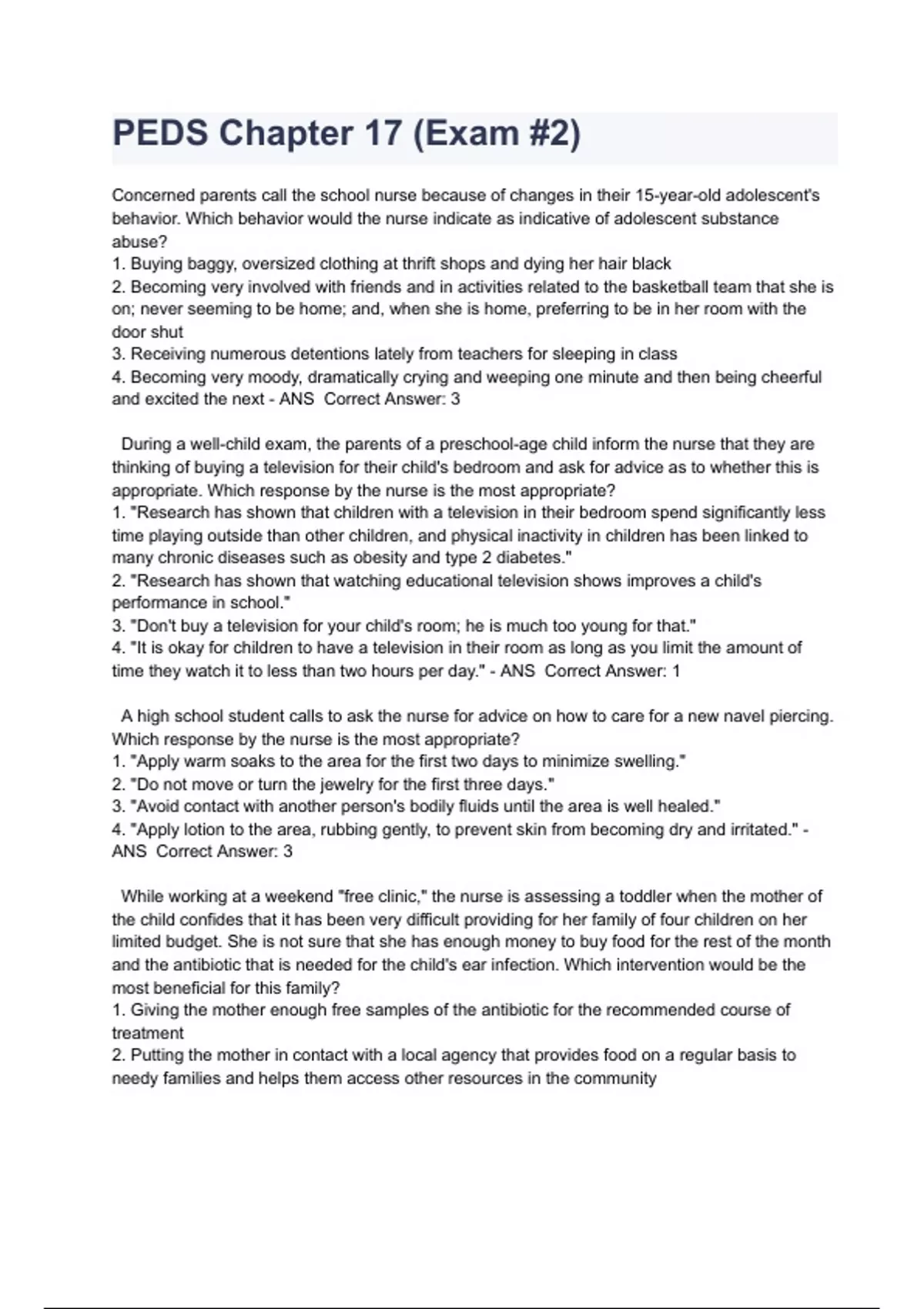 PEDS Chapter 17 (Exam #2) Concerned parents call the school nurse because of changes in their 15-year-old adolescent's behavior. Which behavior would the nurse indicate as indicative of adolescent substance abuse? 1. Buying baggy, oversized clothing at thrift shops and dying her hair black 2. Becoming very involved with friends and in activities related to the basketball team that she is on; never seeming to be home; and, when she is home, preferring to be in her room with the door shut 3. Receiving numerous detentions lately from teachers for sleeping in class 4. Becoming very moody, dramatically crying and weeping one minute and then being cheerful and excited the next - ANS Correct Answer: 3 During a well-child exam, the parents of a preschool-age child inform the nurse that they are thinking of buying a television for their child's bedroom and ask for advice as to whether this is appropriate. Which response by the nurse is the most appropriate? 1. "Research has shown that children with a television in their bedroom spend significantly less time playing outside than other children, and physical inactivity in children has been linked to many chronic diseases such as obesity and type 2 diabetes." 2. "Research has shown that watching educational television shows improves a child's performance in school." 3. "Don't buy a television for your child's room; he is much too young for that." 4. "It is okay for children to have a television in their room as long as you limit the amount of time they watch it to less than two hours per day." - ANS Correct Answer: 1 A high school student calls to ask the nurse for advice on how to care for a new navel piercing. Which response by the nurse is the most appropriate? 1. "Apply warm soaks to the area for the first two days to minimize swelling." 2. "Do not move or turn the jewelry for the first three days." 3. "Avoid contact with another person's bodily fluids until the area is well healed." 4. "Apply lotion to the area, rubbing gently, to prevent skin from becoming dry and irritated." - ANS Correct Answer: 3 While working at a weekend "free clinic," the nurse is assessing a toddler when the mother of the child confides that it has been very difficult providing for her family of four children on her limited budget. She is not sure that she has enough money to buy food for the rest of the month and the antibiotic that is needed for the child's ear infection. Which intervention would be the most beneficial for this family? 1. Giving the mother enough free samples of the antibiotic for the recommended course of treatment 2. Putting the mother in contact with a local agency that provides food on a regular basis to needy families and helps them access other resources in the community