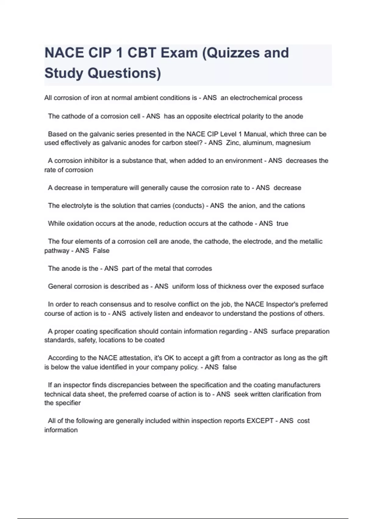 NACE CIP 1 CBT Exam (Quizzes and Study Questions) All corrosion of iron at normal ambient conditions is - ANS an electrochemical process The cathode of a corrosion cell - ANS has an opposite electrical polarity to the anode Based on the galvanic series presented in the NACE CIP Level 1 Manual, which three can be used effectively as galvanic anodes for carbon steel? - ANS Zinc, aluminum, magnesium A corrosion inhibitor is a substance that, when added to an environment - ANS decreases the rate of corrosion A decrease in temperature will generally cause the corrosion rate to - ANS decrease The electrolyte is the solution that carries (conducts) - ANS the anion, and the cations While oxidation occurs at the anode, reduction occurs at the cathode - ANS true The four elements of a corrosion cell are anode, the cathode, the electrode, and the metallic pathway - ANS False The anode is the - ANS part of the metal that corrodes General corrosion is described as - ANS uniform loss of thickness over the exposed surface In order to reach consensus and to resolve conflict on the job, the NACE Inspector's preferred course of action is to - ANS actively listen and endeavor to understand the postions of others. A proper coating specification should contain information regarding - ANS surface preparation standards, safety, locations to be coated According to the NACE attestation, it's OK to accept a gift from a contractor as long as the gift is below the value identified in your company policy. - ANS false If an inspector finds discrepancies between the specification and the coating manufacturers technical data sheet, the preferred coarse of action is to - ANS seek written clarification from the specifier All of the following are generally included within inspection reports EXCEPT - ANS cost information Inspectors reports provide sufficient detail permitting the owner to evaluate - ANS contractor's performance, inspector's performance, job progress, work interruptions When applying coatings, instruction regarding appropriate types of Personal Protection Equipment (PPE) will always be found within the - ANS material safety data sheet (MSDS) or safety data sheet (SDS) Material inventory report should contain all of the following EXCEPT - ANS overall cost of materials Safety enforcement is one of the primary responsibilities of the coating inspector - ANS false If the relative humidity is too high, solvent entrapment within the coating film may occur. - ANS true The dew point is the - ANS temperature at which moisture condenses on a surface. Steel surface temperature reading should be taken - ANS at the actual work locations The coatings inspector must calibrate the magnetic surface thermometer at the job site. - ANS False If solvent is trapped in a coating film it may - ANS cause problems with the curing of the film. Electronic Surface Contact Thermometers - ANS do not require stabilization prior to use MOST coatings in the industrial and marine field are inorganic coatings? - ANS False The predominant pigment in sacrificial coating is - ANS zinc The vehicle of a coating consists of - ANS solvent, binder, and liquid additivess All of the following dissolve within the coating EXCEPT - ANS pigments Which coating type slows the penetration of oxygen, water, and soluble salts to form electrolyte at the coating/metal surface? - ANS barrier coatings Mud cracking of an inorganic zinc-rich (IOZ) primer can be caused by - ANS applying the coating too thick All of the following are commonly used as primers for steel structures EXCEPT - ANS vinyl esters Convertible coatings cure by - ANS a variety of polymerization mechanisms Water-borne emulsions (latex) cure by a process known as - ANS coalescence.