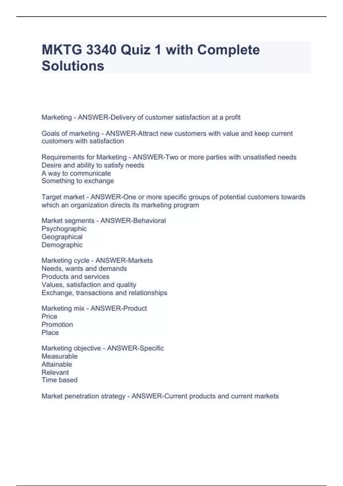 MKTG 3340 Quiz 1 with Complete Solutions MKTG 3340 Quiz 1 with Complete Solutions MKTG 3340 Quiz 1 with Complete Solutions Marketing - ANSWER-Delivery of customer satisfaction at a profit Goals of marketing - ANSWER-Attract new customers with value and keep current customers with satisfaction Requirements for Marketing - ANSWER-Two or more parties with unsatisfied needs Desire and ability to satisfy needs