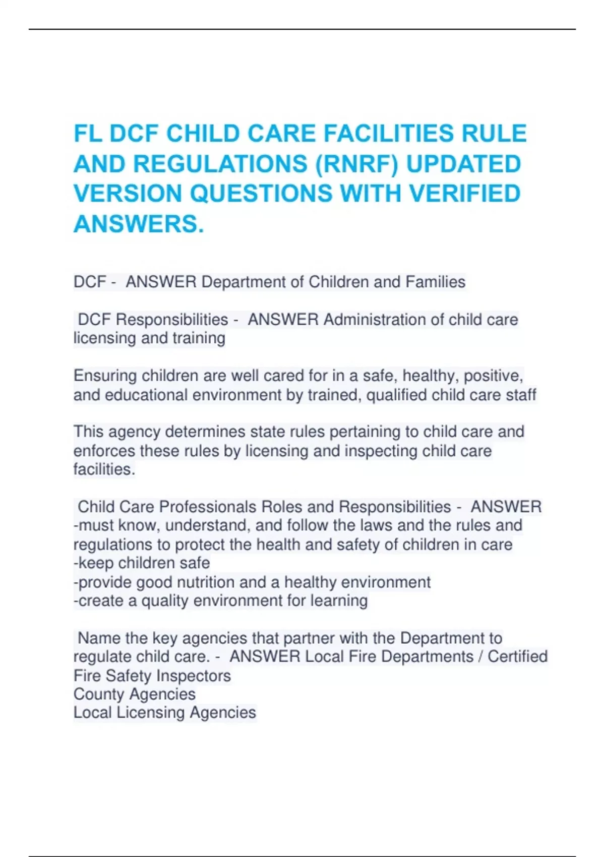 FL DCF CHILD CARE FACILITIES RULE AND REGULATIONS (RNRF) UPDATED VERSION QUESTIONS WITH VERIFIED ANSWERS. DCF - ANSWER Department of Children and Families DCF Responsibilities - ANSWER Administration of child care licensing and training Ensuring children are well cared for in a safe, healthy, positive, and educational environment by trained, qualified child care staff This agency determines state rules pertaining to child care and enforces these rules by licensing and inspecting child care facilities. Child Care Professionals Roles and Responsibilities - ANSWER -must know, understand, and follow the laws and the rules and regulations to protect the health and safety of children in care -keep children safe -provide good nutrition and a healthy environment -create a quality environment for learning Name the key agencies that partner with the Department to regulate child care. - ANSWER Local Fire Departments / Certified Fire Safety Inspectors County Agencies Local Licensing Agencies Child care laws, rules, and regulations are in place to protect - ANSWER children, families, and child care professionals Office of Child Care Regulation and Background Screening - ANSWER licensing authority, regulates licensed child care facilities in most counties in Florida Local County Government Agencies - ANSWER Effect childcare through Zoning and Building, Septic and Well, Etc... City/Municipal Police Dept. - ANSWER Effect childcare through back ground checks and screenings of child care providers Child Care - ANSWER care, protection and supervision of a child for a period of less than 24 hours on a regular basis, which supplements parental care, enrichment, and health supervision for the child in accordance with his or her individual needs, and for which a payment, fee or grant is made for care. (Defined in 402.302) DCF's Office of Child Care Regulations mission: - ANSWER To ensure the health, safety, and well being of the children of the state while in care through licensing and regulatory activities The licensing standards established by the Department address - ANSWER Physical Environment (health, sanitation, safety, and physical surroundings) Children in Care (health, nutrition, and development) Regulation - ANSWER a law, rule, ordinance, or other order prescribed by authority to regulate conduct What is the intent of the Legislature? - ANSWER To protect the health and welfare of children To develop a regulatory framework that promotes the growth and stability of the child care industry and facilitates the safe physical, intellectual, motor, and social development of the child. Child Care Regulation Program - ANSWER is responsible for regulating programs that provide services that meet the statutory definition of "child care." This is accomplished through the inspection of licensed child care programs to ensure the consistent statewide application of child care standards established in statute and rule, and the registration of child care providers not subject to inspection. Minimum Age Requirements - ANSWER A staff person at least 21 years of age must be in charge of the program and must be on the premises at all times during operating hours. Mixed Age Groups - ANSWER A. In groups of mixed age
