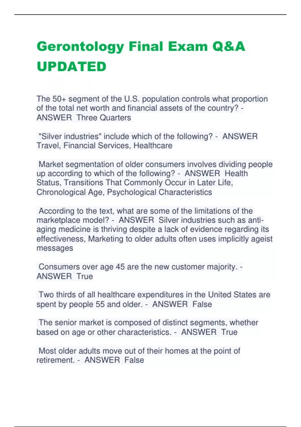 Gerontology Final Exam Q&A UPDATED The 50+ segment of the U.S. population controls what proportion of the total net worth and financial assets of the country? - ANSWER Three Quarters "Silver industries" include which of the following? - ANSWER Travel, Financial Services, Healthcare Market segmentation of older consumers involves dividing people up according to which of the following? - ANSWER Health Status, Transitions That Commonly Occur in Later Life, Chronological Age, Psychological Characteristics According to the text, what are some of the limitations of the marketplace model? - ANSWER Silver industries such as antiaging medicine is thriving despite a lack of evidence regarding its effectiveness, Marketing to older adults often uses implicitly ageist messages Consumers over age 45 are the new customer majority. - ANSWER True Two thirds of all healthcare expenditures in the United States are spent by people 55 and older. - ANSWER False The senior market is composed of distinct segments, whether based on age or other characteristics. - ANSWER True Most older adults move out of their homes at the point of retirement. - ANSWER False Evidence shows that older people can be motivated to buy and use new products or services if they see a clear benefit in what is offered. - ANSWER True Marketing has often missed the target of older consumers by failing to recognize the crucial dimension of individual differences. - ANSWER True Anti-aging medicine hasn't been very appealing to consumers. - ANSWER False The power of cumulative advantage and disadvantage means that, as we grow older, inequality is likely to increase. - ANSWER True According to the U.S. Department of Labor, careers in aging are expected to be a high-growth area during the next decade. - ANSWER True Ageism—age stereotyping—was created by the advertising industry. - ANSWER False Of all social media users, 33% are baby boomers - ANSWER True The majority of older adults surveyed recently indicated that technology use is not very important to them. - ANSWER False Anti-aging medicine has been proven to increase maximum life span and slow biological aging. - ANSWER False Advertising and marketing tends to ignore the potential of the older adult market. - ANSWER True Approximately how many babies were born during the "Baby Boom" generation? - ANSWER 77 million The "Baby Boomer" generation refers to people born between which years? - ANSWER There is a large amount of _______ among members of the "Baby Boomer" generation. - ANSWER Heterogeneity Which model allows us to look at factors that will influence members of cohorts? - ANSWER Age-Period-Cohort Effects that impact all age groups in society at the same time are called ______. - ANSWER Period Effects Effects associated with events affe