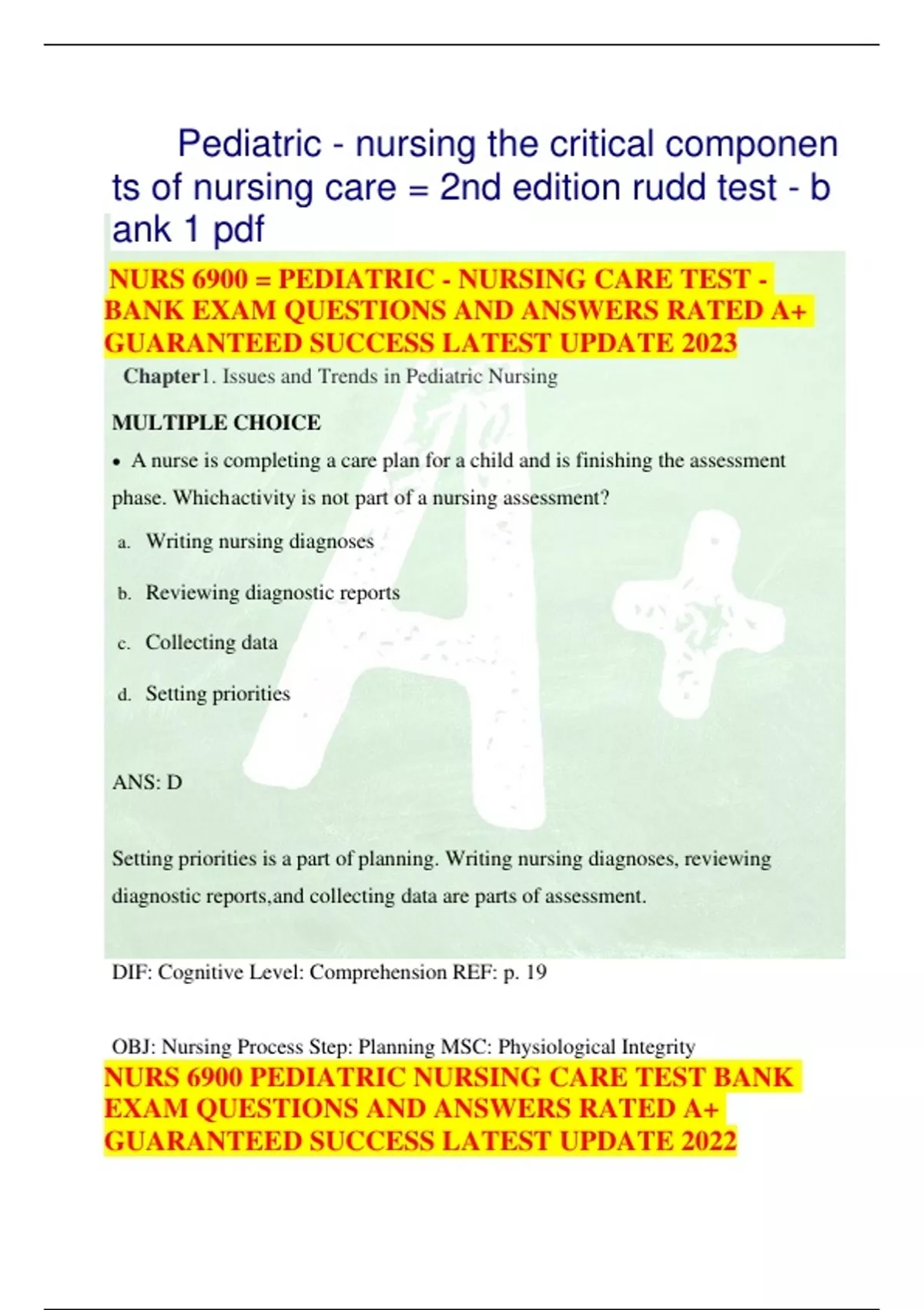 Pediatric - nursing the critical componen ts of nursing care = 2nd edition rudd test - b ank 1 pdf