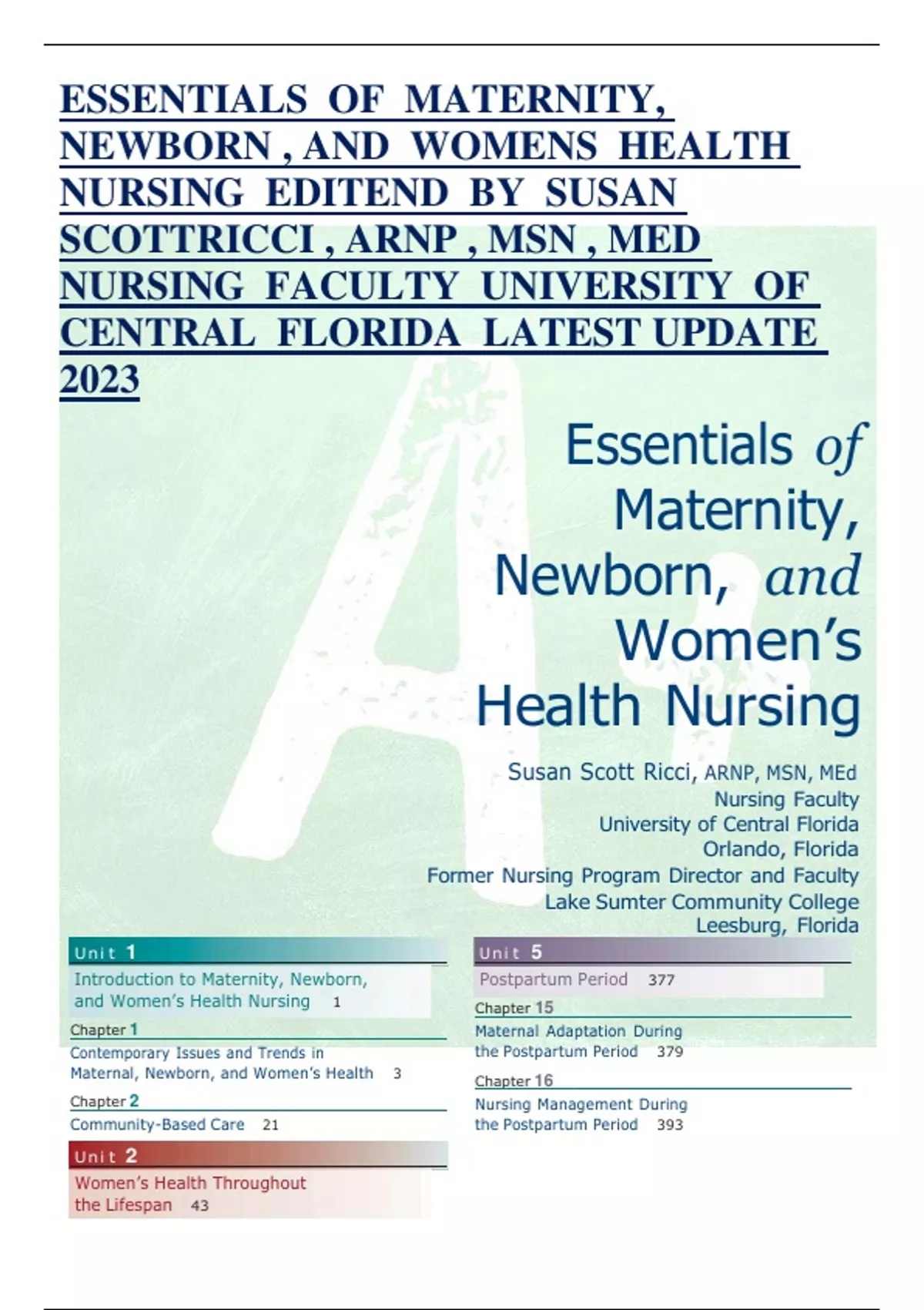 ESSENTIALS OF MATERNITY, NEWBORN , AND WOMENS HEALTH NURSING EDITEND BY SUSAN SCOTTRICCI , ARNP , MSN , MED NURSING FACULTY UNIVERSITY OF CENTRAL FLORIDA LATEST UPDATE 2023