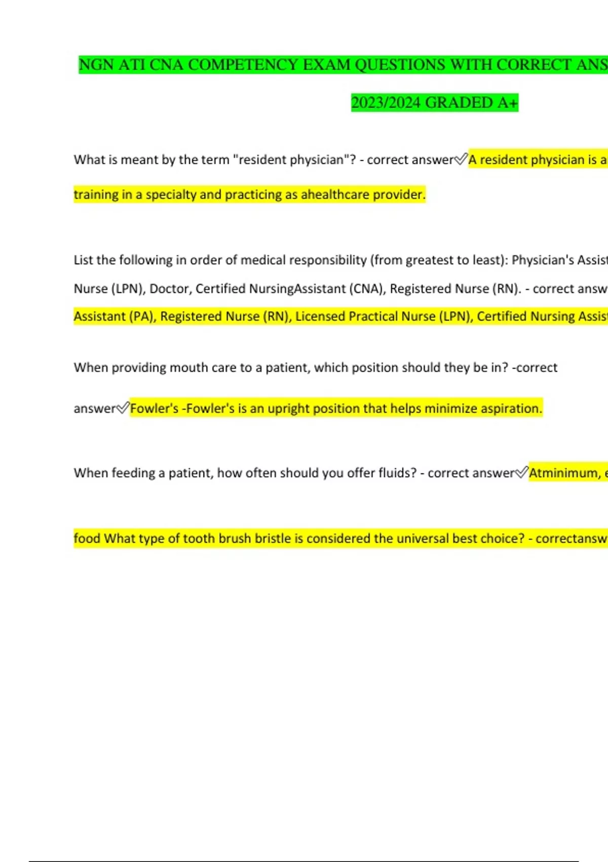 NGN ATI CNA Competency Exam with Answers/NGN ATI CNA Competency Exam with Answers/NGN ATI CNA Competency Exam with Answers