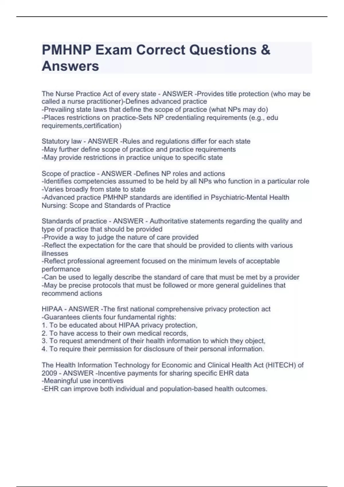 The Nurse Practice Act of every state - ANSWER -Provides title protection (who may be called a nurse practitioner)-Defines advanced practice -Prevailing state laws that define the scope of practice (what NPs may do) -Places restrictions on practice-Sets NP credentialing requirements (e.g., edu requirements,certification) Scope of practice - ANSWER -Defines NP roles and actions -Identifies competencies assumed to be held by all NPs who function in a particular role -Varies broadly from state to state -Advanced practice PMHNP standards are identified in Psychiatric-Mental Health Nursing: Scope and Standards Statutory law - ANSWER -Rules and regulations differ for each state -May further define scope of practice and practice requirements -May provide restrictions in practice unique to specific state of Practice Standards of practice - ANSWER - Authoritative statements regarding the quality and type of practice that should be provided -Provide a way to judge the nature of care provided -Reflect the expectation for the care that should be provided to clients with various illnesses -Reflect professional agreement focused on the minimum levels of acceptable performance -Can be used to legally describe the standard of care that must be met by a provider -May be precise protocols that must be followed or more general guidelines that recommend actions HIPAA - ANSWER -The first national comprehensive privacy protection act -Guarantees clients four fundamental rights: 1. To be educated about HIPAA privacy protection, 2. To have access to their own medical records, 3. To request amendment of their health information to which they object, 4. To require their permission for disclosure of their personal information. The Health Information Technology for Econ