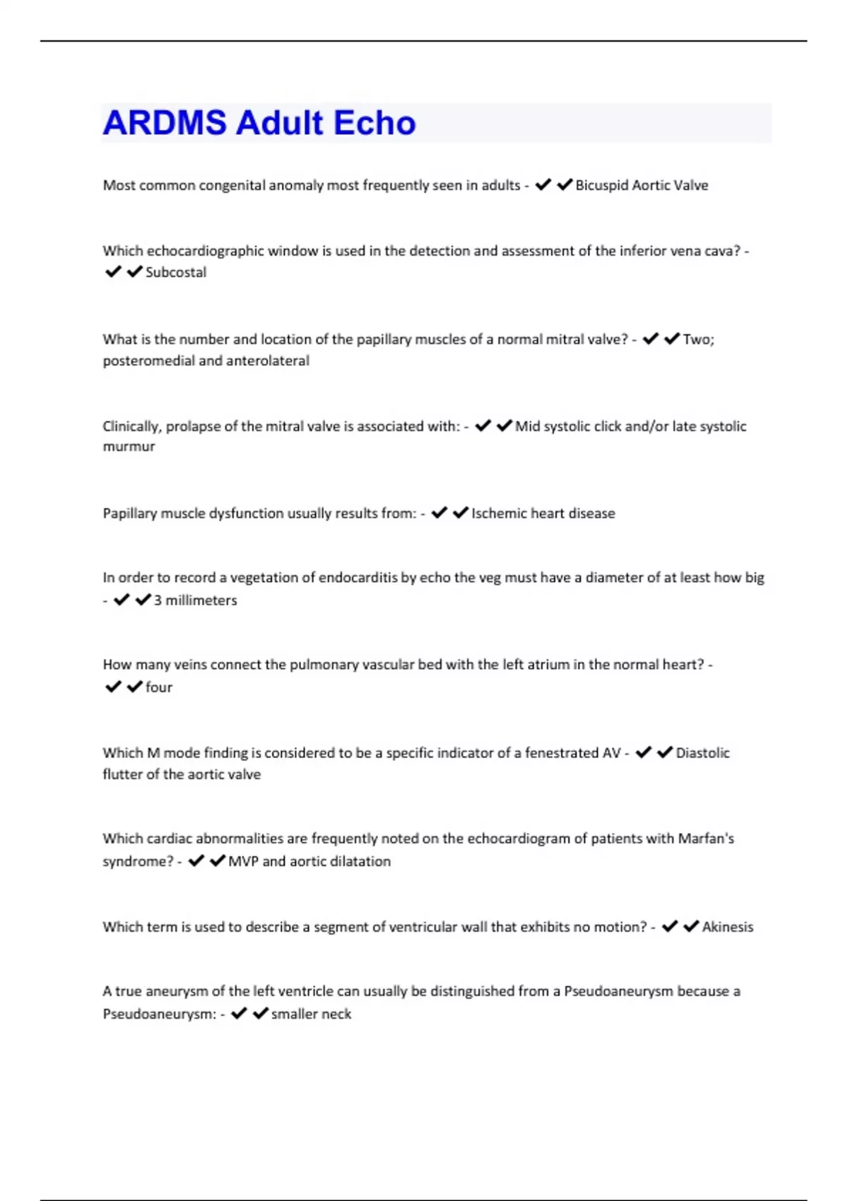 Most common congenital anomaly most frequently seen in adults - Bicuspid Aortic Valve Which echocardiographic window is used in the detection and assessment of the inferior vena cava? - Subcostal What is the number and location of the papillary muscles of a normal mitral valve? - Two; posteromedial and anterolateral Clinically, prolapse of the mitral valve is associated with: - Mid systolic click and/or late systolic murmur Papillary muscle dysfunction usually results from: - Ischemic heart disease In order to record a vegetation of endocarditis by echo the veg must have a diameter of at least how big - 3 millimeters How many veins connect the pulmonary vascular bed with the left atrium in the normal heart? - four Which M mode finding is considered to be a specific indicator of a fenestrated AV - Diastolic flutter of the aortic valve Which cardiac abnormalities are frequently noted on the echocardiogram of patients with Marfan's syndrome? - MVP and aortic dilatation Which term is used to describe a segment of ventricular wall that exhibits no motion? - Akinesis A true aneurysm of the left ventricle can usually be distinguished from a Pseudoaneurysm because a Pseudoaneurysm: - smaller neckWhich type of cardiomyopathy is associated with amyloidosis? - Infiltrative In a patient with carcinoid heart disease, the cardiac sonographer must devote special attention to identifying abnormalities of the: - Tricuspid valve