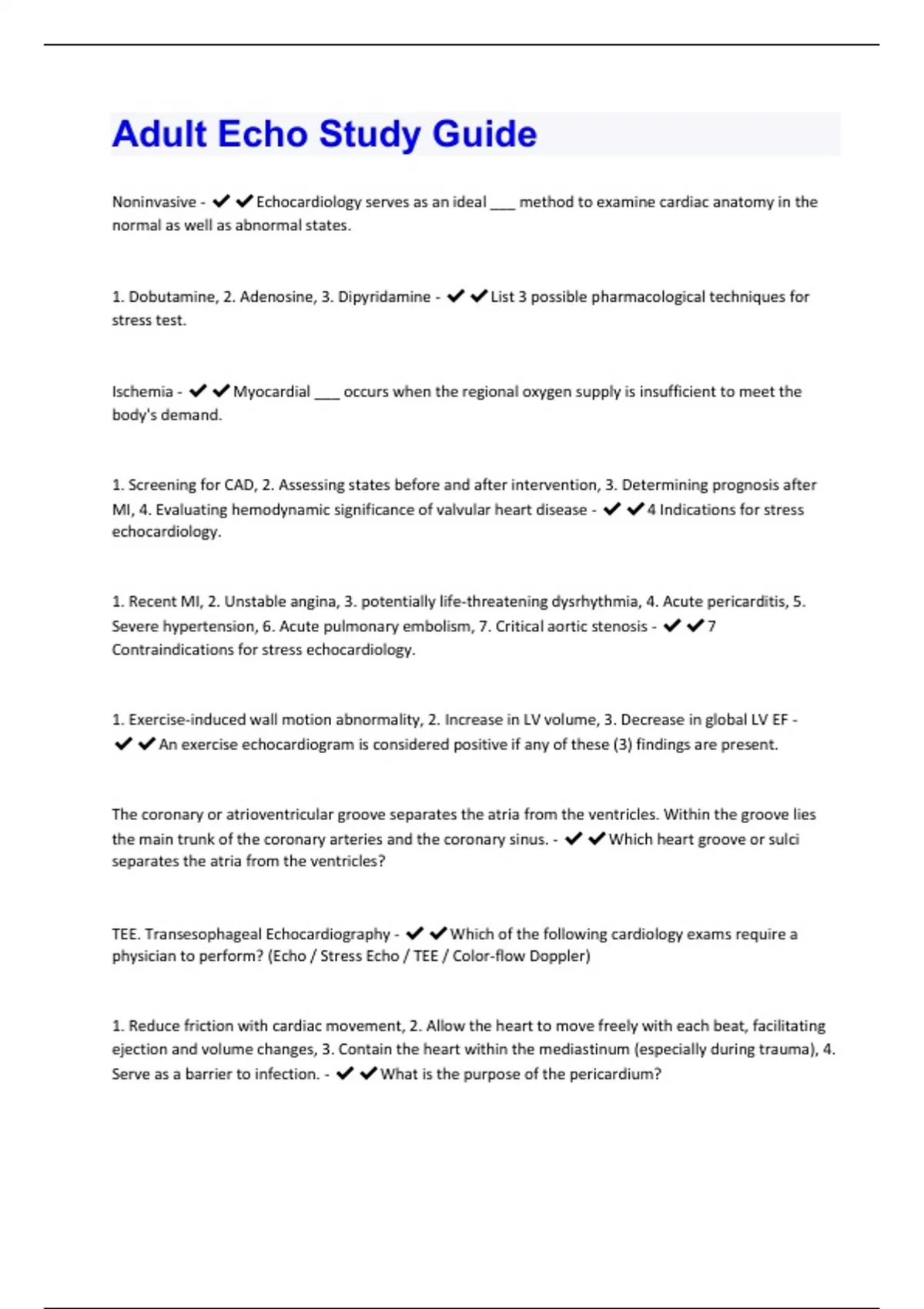 Noninvasive - Echocardiology serves as an ideal ___ method to examine cardiac anatomy in the normal as well as abnormal states. 1. Dobutamine, 2. Adenosine, 3. Dipyridamine - List 3 possible pharmacological techniques for stress test. Ischemia - Myocardial ___ occurs when the regional oxygen supply is insufficient to meet the body's demand. 1. Screening for CAD, 2. Assessing states before and after intervention, 3. Determining prognosis after MI, 4. Evaluating hemodynamic significance of valvular heart disease - 4 Indications for stress echocardiology. 1. Recent MI, 2. Unstable angina, 3. potentially life-threatening dysrhythmia, 4. Acute pericarditis, 5. Severe hypertension, 6. Acute pulmonary embolism, 7. Critical aortic stenosis - 7 Contraindications for stress echocardiology. 1. Exercise-induced wall motion abnormality, 2. Increase in LV volume, 3. Decrease in global LV EF - An exercise echocardiogram is considered positive if any of these (3) findings are present. The coronary or atrioventricular groove separates the atria from the ventricles. Within the groove lies the main trunk of the coronary arteries and the coronary sinus. - Which heart groove or sulci separates the atria from the ventricles? TEE. Transesophageal Echocardiography - Which of the following cardiology exams require a physician to perform? (Echo / Stress Echo / TEE / Color-flow Doppler) 1. Reduce friction with cardiac movement, 2. Allow the heart to move freely with each beat, facilitating ejection and volume changes, 3. Contain the heart within the mediastinum (especially during trauma), 4. Serve as a barrier to infection. - What is the purpose of the pericardium?Left Ventricle - What is the largest cardiac chamber? 4 Pulmonary veins. 2 from each lung. They carry oxygenated blood from the lungs to the left atrium of the heart. - The left atrium receives how many pulmonary veins?