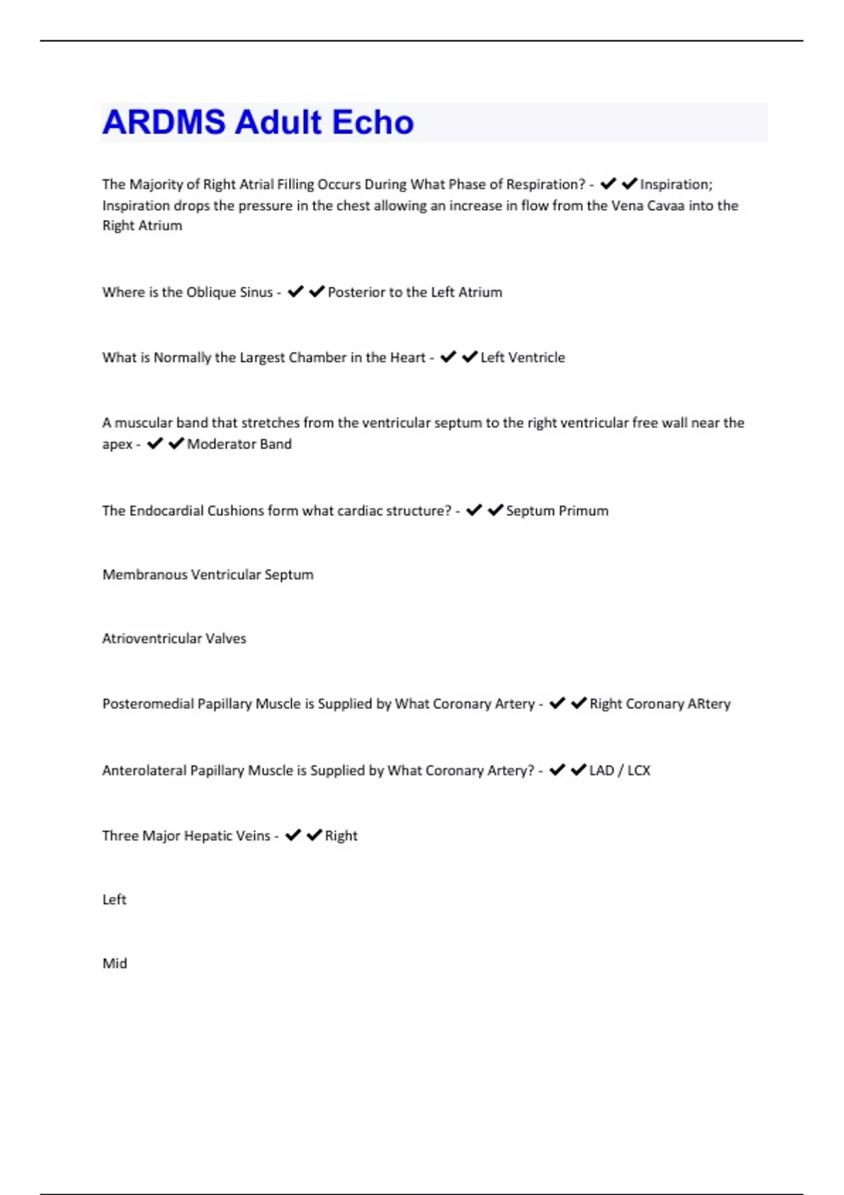 ARDMS Adult Echo The Majority of Right Atrial Filling Occurs During What Phase of Respiration? - ✔✔ Inspiration; Inspiration drops the pressure in the chest allowing an increase in flow from the Vena Cavaa into the Right Atrium Where is the Oblique Sinus - ✔✔ Posterior to the Left Atrium What is Normally the Largest Chamber in the Heart - ✔✔ Left Ventricle A muscular band that stretches from the ventricular septum to the right ventricular free wall near the apex - ✔✔ Moderator Band The Endocardial Cushions form what cardiac structure? - ✔✔ Septum Primum Membranous Ventricular Septum Atrioventricular Valves Posteromedial Papillary Muscle is Supplied by What Coronary Artery - ✔✔ Right Coronary ARtery Anterolateral Papillary Muscle is Supplied by What Coronary Artery? - ✔✔ LAD / LCX Three Major Hepatic Veins - ✔✔ Right Left Mid Duration of a Normal QRS Complex is - ✔✔ < 12.0 msec In a Normal Heart What all Empties into a Coronary Sinus - ✔✔ Small Cardiac Vein Middle Cardiac Vein Great Cardiac Vein What Should Not Empty into the Coronary Sinus - ✔✔ SVC Defined as a part of the Fetal Circulation that connects the Pulmonary Artery and the Descending Aorta - ✔✔ Ductus Arteriosus Coronary Vessels Courses through the Anterior Intraventricular Groove? - ✔✔ LAD Middle Coronary Artery Courses Through - ✔✔ Posterior Interventricular Groove The Left Circumflex Artery Courses Through - ✔✔ Left Atrioventricular Groove The Coronary Sinuses Courses Within - ✔✔ Posterior Atrioventricular Groove Basal Wall Segments of the LV - ✔✔ Located between the Atrioventricular Groove and the Tips of the Papillary Muscle Mid Segments - ✔✔ Segements that include the papillary muscle Apical Segments - ✔✔ Loca ted between the base of the papillary muscle to the apex