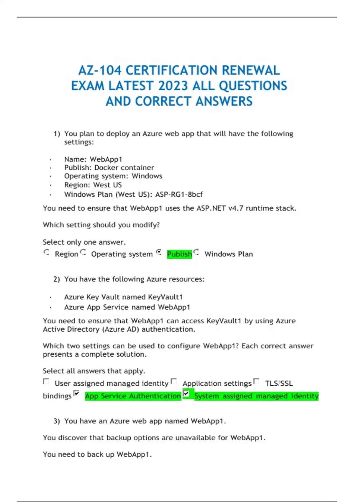 AZ-104 CERTIFICATION RENEWAL EXAM LATEST 2023 ALL QUESTIONS AND CORRECT ANSWERS
