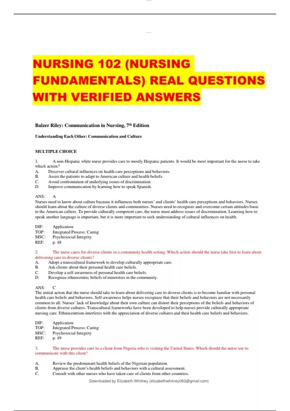 NURSING 102 (NURSING FUNDAMENTALS) REAL QUESTIONS WITH VERIFIED ANSWERS Balzer Riley: Communication in Nursing, 7 th Edition Understanding Each Other: Communication and Culture MULTIPLE CHOICE 1. A non-Hispanic white nurse provides care to mostly Hispanic patients. It would be most important for the nurse to take which action? A. Discover cultural influences on health care perceptions and behaviors. B. Assist the patients to adapt to American culture and health beliefs. C. Avoid confrontation of underlying issues of discrimination. D. Improve communication by learning how to speak Spanish. ANS: A Nurses need to know about culture because it influences both nurses’ and clients’ health care perceptions and behaviors. Nurses should learn about the culture of diverse clients and communities. Nurses need to recognize and overcome certain attitudes basic to the American culture. To provide culturally competent care, the nurse must address issues of discrimination. Learning how to speak another language is important, but it is more important to seek understanding of cultural influences on health. DIF: Application TOP: Integrated Process: Caring MSC: Psychosocial Integrity REF: p. 48 2. The nurse cares for diverse clients in a community health setting. Which action should the nurse take first to learn about delivering care to diverse clients? A. Adopt a transcultural framework to develop culturally appropriate care. B. Ask clients about their personal health care beliefs. C. Develop a self-awareness of personal health care beliefs. D. Recognize ethnocentric beliefs of minorities in the community. ANS: C The initial action that the nurse should take to learn about delivering care to diverse clients is to become familiar with personal health care beliefs and behaviors. Self-awareness helps nurses recognize that their beliefs and behaviors are not necessarily common to all. Nurses’ lack of knowledge about their own culture can distort their perceptions of the beliefs and behaviors of clients from diverse cultures. Transcultural frameworks have been developed to help nurses provide culturally appropriate nursing care. Ethnocentrism interferes with the appreciation of diverse cultures and their health care beliefs and behaviors. DIF: Application TOP: Integrated Process: Caring MSC: Psychosocial Integrity REF: p. 49 3. The nurse provides care to a client from Nigeria who is visiting the United States. Which should the nurse use to communicate with this client? A. Review the predominant health beliefs of the Nigerian population. B. Appraise the client’s health beliefs and behaviors with a cultural assessment. C. Consult with other nurses who have taken care of clients from other countries. lOMoAR cPSD| Downloaded by Elizabeth Whitney () D. Use standard communication techniques to establish a helping relationship. ANS: B Tripp-Reimer and Afifi (1989) suggest two processes that nurses may use to communicate with clients from diverse cultures: cultural assessment and cultural negotiation. Cultural assessment refers to the appraisal of a client’s health beliefs and behaviors. The information is then used to determine appropriate nursing interventions. Cultural negotiation refers to the process of negotiating with the client regarding differences in the lay and professional belief systems concerning appropriate care. Information obtained from other sources (e.g., written documents, other nurses, experts, standards) is not specific to this client’s health beliefs and behaviors. DIF: Application TOP: Integrated Process: Caring MSC: Psychosocial Integrity REF: p. 49 4. The nurse needs to obtain a health history from a Spanish-speaking patient. Which action by the nurse is best? A. Ask a bilingual friend of the patient to interpret. B. Use nonverbal communication and draw pictures. C. Request a Spanish-speaking medical interpreter. D. Interview the patient’s English-speaking daughter. ANS: C Professional interpreters are able to communicate medical terms and can be of assistance in reducing the risks of breaches in patient privacy and confidentiality. Also, information can be directly obtained from the patient. When family members or volunteers serve as the interpreter, patients are often uncomfortable sharing sensitive information. Family members in a stressful situation may have difficulty being the interpreter. Although nonverbal communication is important, this method should only be used if an interpreter is not available. DIF: Application TOP: Integrated Process: Communication and Documentation MSC: Psychosocial Integrity REF: p. 51 5. The nurse is interviewing a Native American client. It is most important for the nurse to take which action? A. Maintain eye contact to show respect and interest. B. Assess whether the client is comfortable with eye contact. C. Avoid prolonged eye contact with this client. D. Sit next to the patient to avoid any eye contact. ANS: B Eye contact is often cultural; some Native Americans believe that prolonged eye contact is rude and intrusive. However, it is important to assess each individual patient for preferences and comfort with eye contact. DIF: Application TOP: Integrated Process: Communication and Documentation MSC: Psychosocial Integrity REF: p. 53 6. The nurse provides care for a male patient. When the nurse addresses the patient, which would be most appropriate? A. Use both first and last name with each encounter. B. Ask the patient how he prefers to be addressed. C. Call the patient by his first name. D. Address the patient by his last name. ANS: B It is important to call the patient by the name he or she prefers. The nurse should ask a person how he or she prefers to be addressed, because considerable cultural variation exists. Most Americans are comfortable with calling people by their first names. This is perceived by some, however, as a failure to show respect. DIF: Application TOP: Integrated Process: Communication and Documentation MSC: Psychosoc