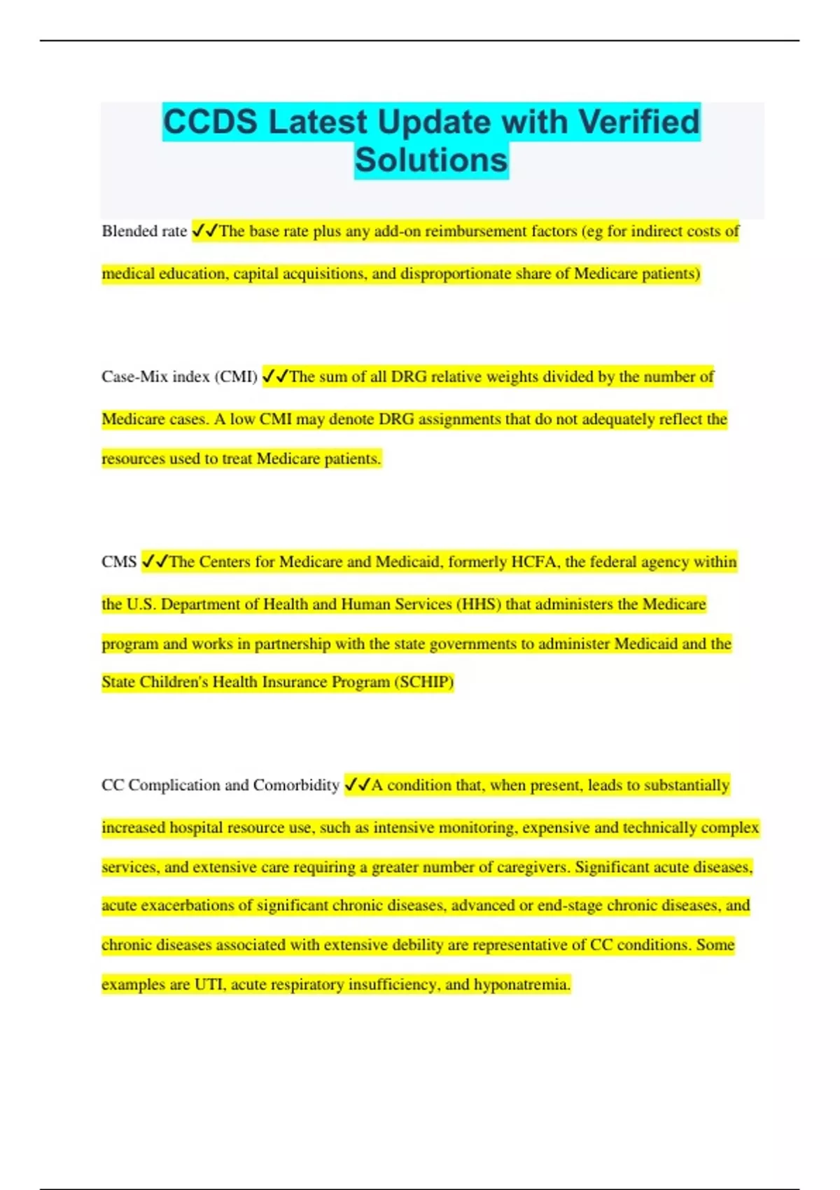 CCDS Latest Update with Verified Solutions Blended rate The base rate plus any add-on reimbursement factors (eg for indirect costs of medical education, capital acquisitions, and disproportionate share of Medicare patients) Case-Mix index (CMI) The sum of all DRG relative weights divided by the number of Medicare cases. A low CMI may denote DRG assignments that do not adequately reflect the resources used to treat Medicare patients. CMS The Centers for Medicare and Medicaid, formerly HCFA, the federal agency within the U.S. Department of Health and Human Services (HHS) that administers the Medicare program and works in partnership with the state governments to administer Medicaid and the State Children's Health Insurance Program (SCHIP) CC Complication and Comorbidity A condition that, when present, leads to substantially increased hospital resource use, such as intensive monitoring, expensive and technically complex services, and extensive care requiring a greater number of caregivers. Significant acute diseases, acute exacerbations of significant chronic diseases, advanced or end-stage chronic diseases, and chronic diseases associated with extensive debility are representative of CC conditions. Some examples are UTI, acute respiratory insufficiency, and hyponatremia. ICD-9-CM The International Classification of Diseases, 9th Revision, Clinical Modification. This is the official system of assigning codes to diagnoses and procedures associated with hospital utilization in the United States. IPPS Inpatient prospective payment system A government system for reimbursement of hospital services based on prospectively set rates. MCC Major complication and comorbidity Diagnosis code that reflects the highest level of severity of illness. Some examples are sepsis, acute respiratory failure, acute renal failure, and acute systolic/diastolic heart failure. MS-DRG Medicare Severity diagnosis-related group A payment group for Medicare patients. Patients with similar clinical indicators and costs are linked to a fixed payment based on average costs of patients in the group. Non-OR procedure A procedure performed for the purpose of diagnosing versus definitive treatement. These are generally nonreimbursable, and payment is considered to be bundled into the payment for the medical DRG. OIG Office of Inspector General Assigned to protect the integrity of the HHS programs and the health and welfare of the beneficiaries of these programs. This is accomplished through a nationwide network of audits, investigations, inspections, and other mission-related functions. Outliers Exceptional cases for which additional Medicare payment may be available when the cost of care is outside the expected norm for a DRG. PDx Principal diagnosis Condition determined, after careful study, to be chiefly responsible for creating the need for inpatient hospitalization; the foundation for the DRG assignment. Principal procedure A procedure that was performed for definitive treatment (rather than diagnostic or exploratory purposes) or was necessary to treat a complication. The procedure may be performed in the OR; however, an OR setting is not required to assign a code for the procedure. The principle procedure usually is related to the principal diagnosis. QIO Quality Improvement Organization Contracted with Medicare in each state to monitor and improve the quality of care given to Medicare patients; formerly known as PRO or Peer Review Orginization. RAC Recovery Audit Contractor A program established by the Medicare Prescription Drug, Improvement and Modernization Act of 2003 to identify improper Medicare over-and underpayments. Begun as a three-state demonstration program, it expanded to a 50-state permanent RAC program in 2010. CMS later change the name of the endeavor to the recovery audit program and now calls the agencies conducting such reviews "recovery auditors". RW Relative weight An assigned weight that is intended to reflect the relative resource consumption associated with each DRG. The higher the relative weight, the greater the payment to the hospital. The relative weights are calculated by CMS and published in the final IPPS rule annually. SDx Secondary diagnosis All conditions (secondary) that exist at the time of admission or that develop subsequently that affect the treatment received and/or the length of stay in the hospital. Diagnoses that relate to an earlier episode and that have no bearing on the current hospital stay are not reported. Surgical hierarchy An ordering methodology used when multiple surgical procedures occur during a single inpatient stay. This hierarchy orders surgical classes from most to least resource-intensive; it is used to assign a DRG.