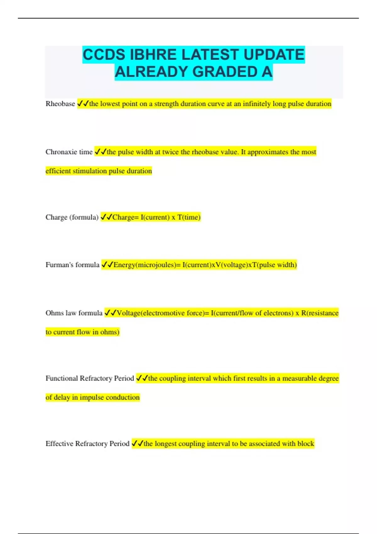 CCDS IBHRE LATEST UPDATE ALREADY GRADED A Rheobase the lowest point on a strength duration curve at an infinitely long pulse duration Chronaxie time the pulse width at twice the rheobase value. It approximates the most efficient stimulation pulse duration Charge (formula) Charge= I(current) x T(time) Furman's formula Energy(microjoules)= I(current)xV(voltage)xT(pulse width) Ohms law formula Voltage(electromotive force)= I(current/flow of electrons) x R(resistance to current flow in ohms) Functional Refractory Period the coupling interval which first results in a measurable degree of delay in impulse conduction Effective Refractory Period the longest coupling interval to be associated with block Devices with NO interaction with pacers 1. microwave oven, 2. CT scan/Ultrasound 3. X-rays (diagnostic) Devices that cause transient or 1 beat inhibition 1. EAS 2. Cellphones 3. Arc Welding 4. airport metal detector 5. TENS 6. Electric appliances such as electric blanket & power tools Devices that may damage the pacemaker 1. MRI 2. Defibrillator 3. Cardioversion 4. Cautery/RF Ablation 5. Radiation Therapy Resistance in Series Series means the beginning of one resistance is connected to another Sum the resistances: R1+R2= total resistance. EX: A LEAD FRACTURE (fractures INCREASE impedance) Resistance in Parallel Parallel means all the resistances are connected to the same point. (R1xR2)/(R1+R2)= total resistance EX: LEAD INSULATION DEFECTS (insulation defects DECREASE impedance) Permanent pacemakers are constant voltage or constant current? ALL permanent pacemakers are constant voltage devices. SOME temp pacemakers are constant voltage, most are constant current. LOAD Load refers to impedance (or resistance) applied to a circuit. A system with a SMALL load (low impedance) applied to the circuit is said to be a constant current device A system with LARGE load is said to be a constant voltage device Guidelines for Permanent Pacing 1. Patient is symptomatic 2. The heart rate is less than 40 bpm 3. Asystole of greater than 3 seconds is documented NOTE: Pt may be asymptomatic with 2 or 3 Slew Rate Slew rate = peak slope of an electrogram slew rate= change in voltage/ change in time Normal slew rate in atrium .3 V/s Normal slew