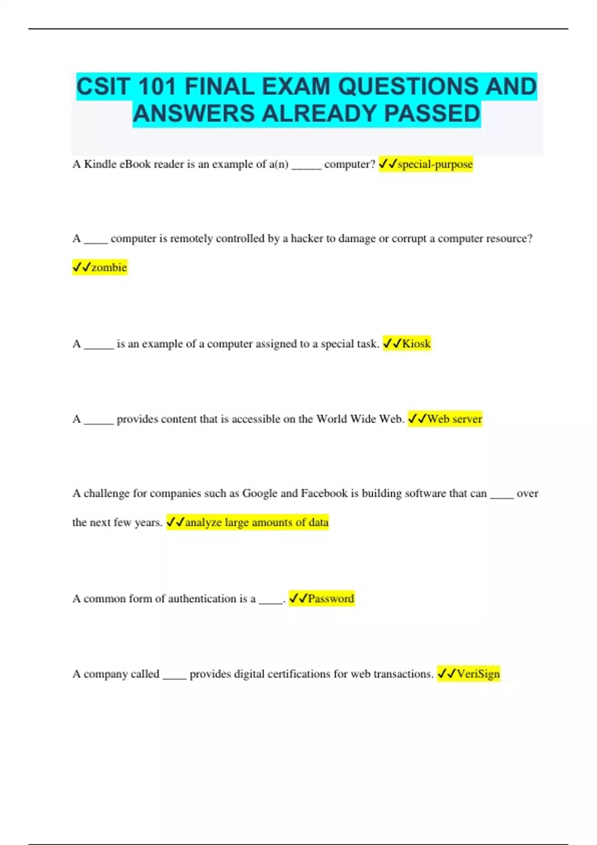CSIT 101 FINAL EXAM QUESTIONS AND ANSWERS ALREADY PASSED A Kindle eBook reader is an example of a(n) _____ computer? special-purpose A ____ computer is remotely controlled by a hacker to damage or corrupt a computer resource? zombie A _____ is an example of a computer assigned to a special task. Kiosk A _____ provides content that is accessible on the World Wide Web. Web server A challenge for companies such as Google and Facebook is building software that can ____ over the next few years. analyze large amounts of data A common form of authentication is a ____. Password A company called ____ provides digital certifications for web transactions. VeriSign A company may hire a ____ hacker to learn about vulnerabilities in its system. White-hat A concern over heavy use of ____ is that it may desensitize the individual to the reality of the real world. violent, interactive simulated games A game console relies on a fast _____ to handle the lively animations in a video game. microprocessor A popular encryption method used to protect data that travels over a wireless network is ____. WPA A popular term used to identify devices such as the iPad is _____. Tablet PC A printer requires a ____ installed on the computer in order to operate. Device Driver A(n) ____ certificate confirms your credentials when conducting business or other transactions on the web. SSL A(n) ____ lifestyle involves ridding oneself of all concerns about privacy. Transparent A(n) ____ view of data is the way a user thinks about data. Logical AI applications are ways in which AI methodologies are applied to ____ and provide services. Solves Problems All of the following are examples of malware EXCEPT ____. Updates An Internet-based crime is referred to as a(n) ____ crime. Cyber An act of ____ would be posting a story to a blog saying that a neighbor is selling drugs, when you know that it's not true. Libel An email with a subject heading "Urgent Security Update" that requests a username and password followed by a link to "re-login and resolve the issue" is a good example of a ____ scam. Phishing An icon on your desktop is a component of a ____ interface. graphical user An important function of a firewall is to protect all the ____ of a network or computer from undesirable data Ports An individual who illegally downloads copyright-protected software is referred to as a ____. Pirate An