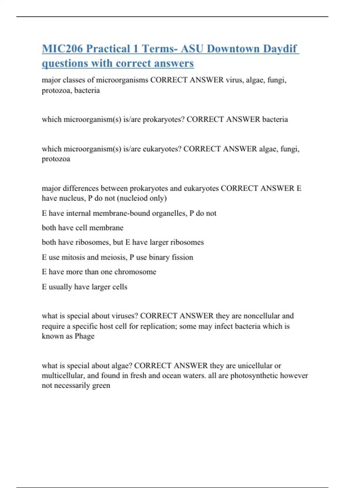 major classes of microorganisms CORRECT ANSWER virus, algae, fungi, protozoa, bacteria which microorganism(s) is/are prokaryotes? CORRECT ANSWER bacteria which microorganism(s) is/are eukaryotes? CORRECT ANSWER algae, fungi, protozoa major differences between prokaryotes and eukaryotes CORRECT ANSWER E have nucleus, P do not (nucleiod only) E have internal membrane-bound organelles, P do not both have cell membrane both have ribosomes, but E have larger ribosomes E use mitosis and meiosis, P use binary fission E have more than one chromosome E usually have larger cells what is special about viruses? CORRECT ANSWER they are noncellular and require a specific host cell for replication; some may infect bacteria which is known as Phage what is special about algae? CORRECT ANSWER they are unicellular or multicellular, and found in fresh and ocean waters. all are photosynthetic however not necessarily green
