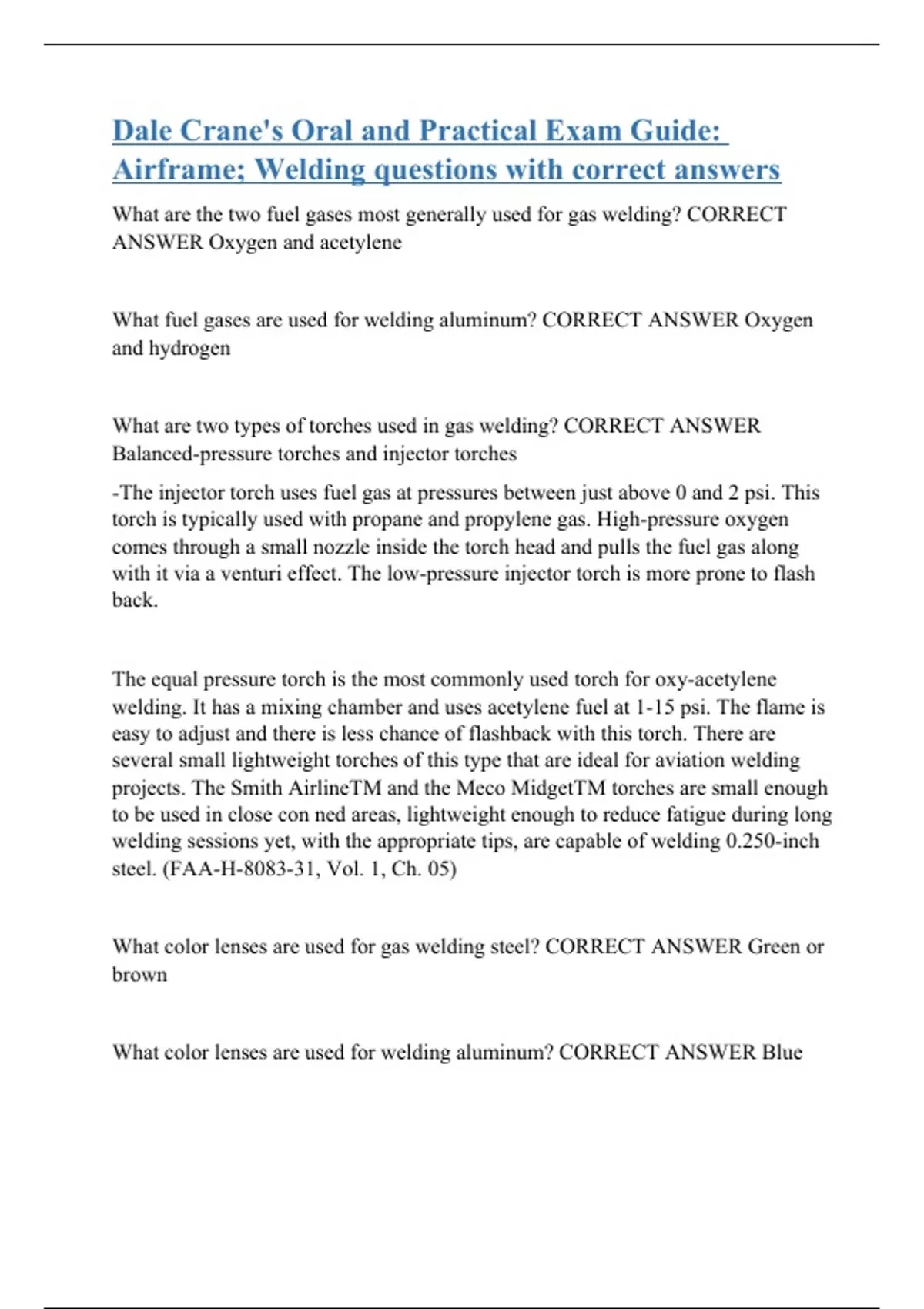 What are the two fuel gases most generally used for gas welding? CORRECT ANSWER Oxygen and acetylene What fuel gases are used for welding aluminum? CORRECT ANSWER Oxygen and hydrogen What are two types of torches used in gas welding? CORRECT ANSWER Balanced-pressure torches and injector torches -The injector torch uses fuel gas at pressures between just above 0 and 2 psi. This torch is typically used with propane and propylene gas. High-pressure oxygen comes through a small nozzle inside the torch head and pulls the fuel gas along with it via a venturi effect. The low-pressure injector torch is more prone to flash back. The equal pressure torch is the most commonly used torch for oxy-acetylene welding. It has a mixing chamber and uses acetylene fuel at 1-15 psi. The flame is easy to adjust and there is less chance of flashback with this torch. There are several small lightweight torches of this type that are ideal for aviation welding projects. The Smith AirlineTM and the Meco MidgetTM torches are small enough to be used in close con ned areas, lightweight enough to reduce fatigue during long welding sessions yet, with the appropriate tips, are capable of welding 0.250-inch steel. (FAA-H-8083-31, Vol. 1, Ch. 05) What color lenses are used for gas welding steel? CORRECT ANSWER Green or brown What color lenses are used for welding aluminum? CORRECT ANSWER Blue