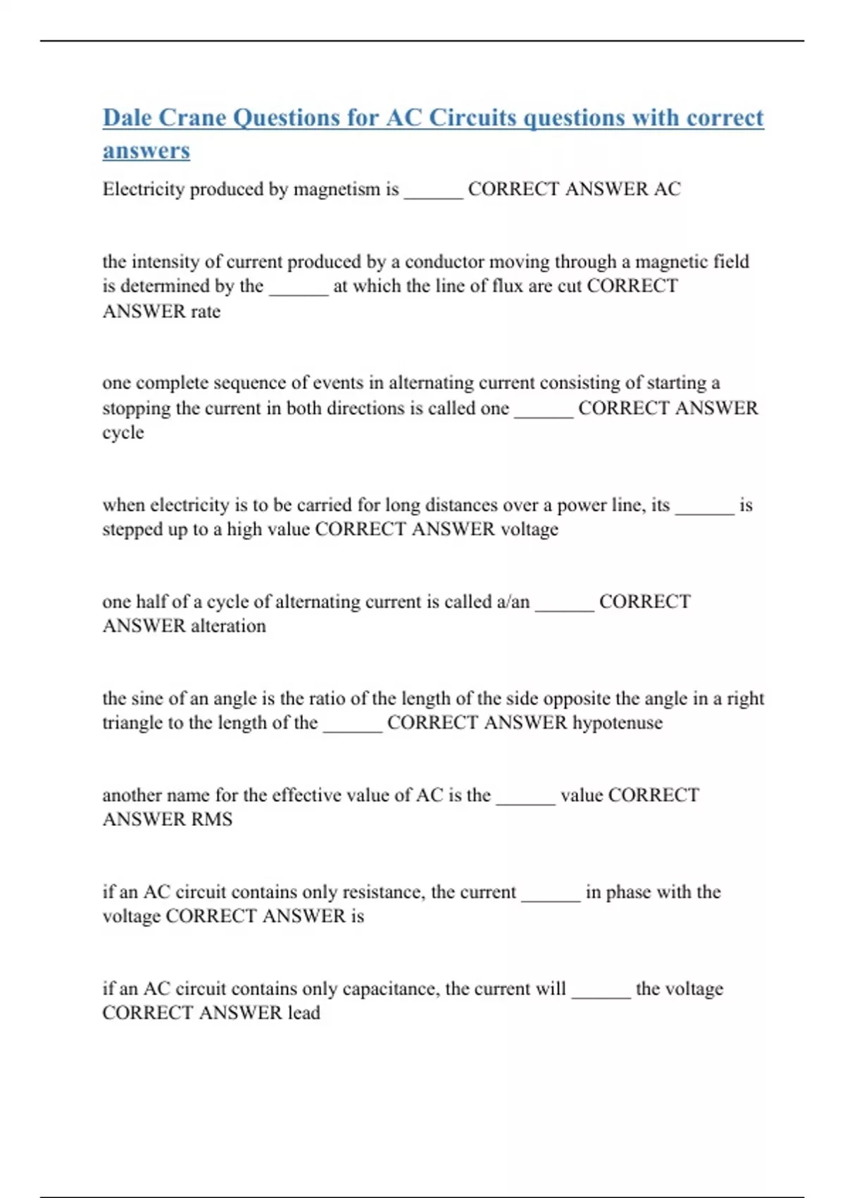 Electricity produced by magnetism is ______ CORRECT ANSWER AC the intensity of current produced by a conductor moving through a magnetic field is determined by the ______ at which the line of flux are cut CORRECT ANSWER rate one complete sequence of events in alternating current consisting of starting a stopping the current in both directions is called one ______ CORRECT ANSWER cycle when electricity is to be carried for long distances over a power line, its ______ is stepped up to a high value CORRECT ANSWER voltage one half of a cycle of alternating current is called a/an ______ CORRECT ANSWER alteration the sine of an angle is the ratio of the length of the side opposite the angle in a right triangle to the length of the ______ CORRECT ANSWER hypotenuse another name for the effective value of AC is the ______ value CORRECT ANSWER RMS if an AC circuit contains only resistance, the current ______ in phase with the voltage CORRECT ANSWER is