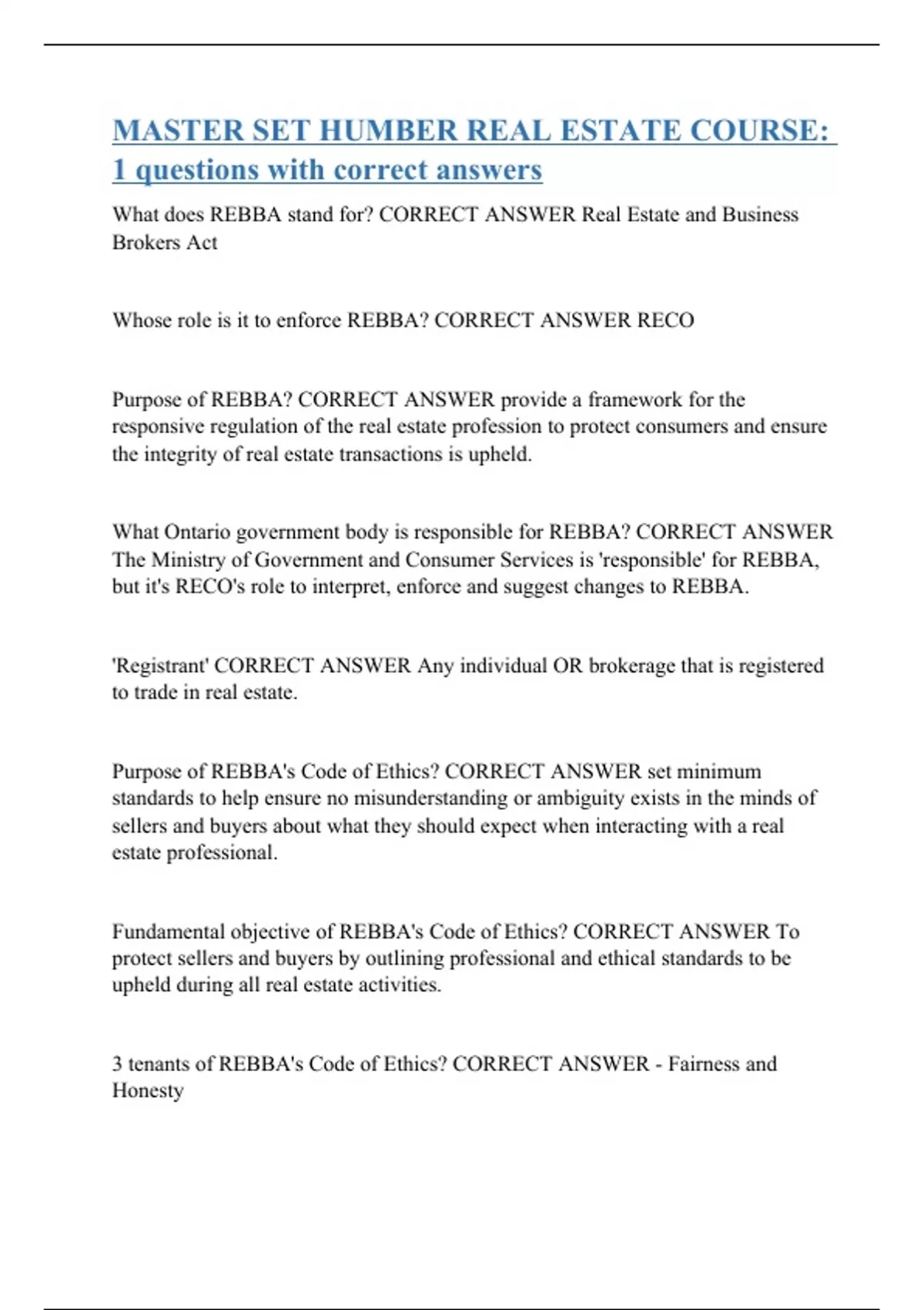 MASTER SET HUMBER REAL ESTATE COURSE: 1 questions with correct answers