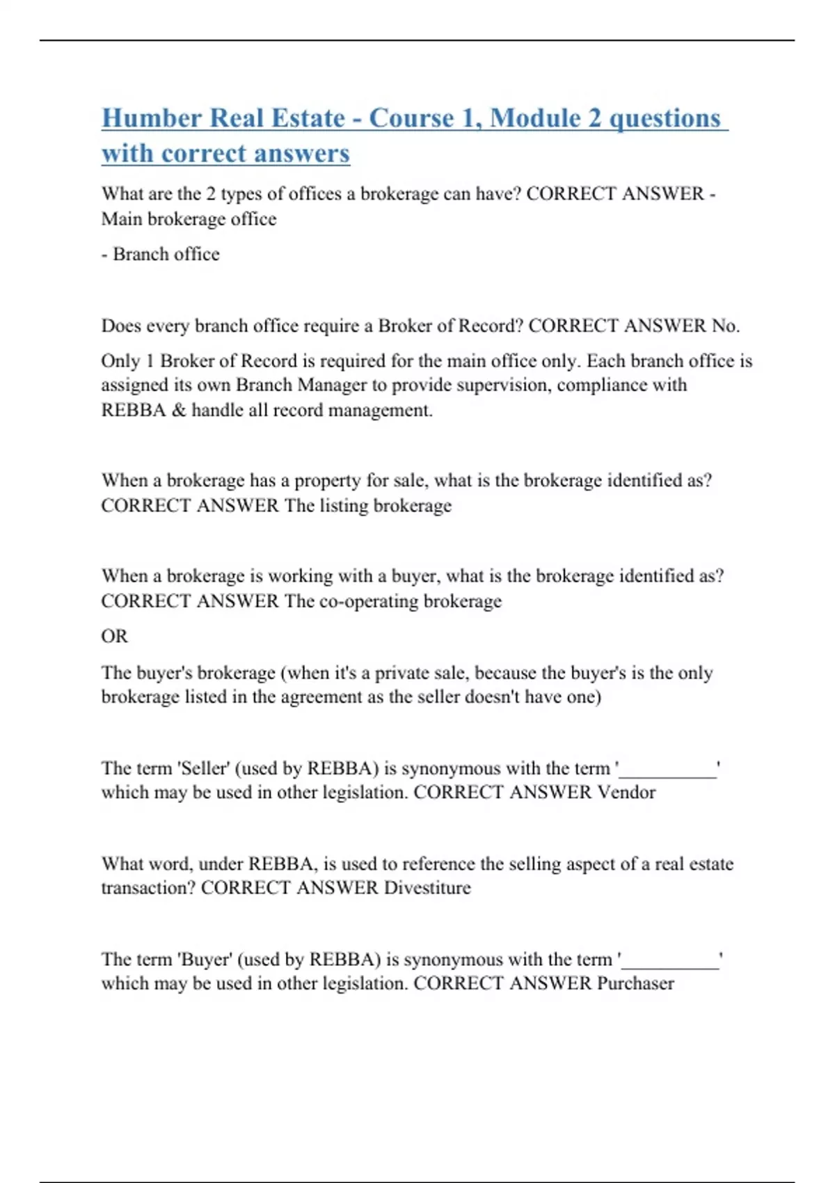 What are the 2 types of offices a brokerage can have? CORRECT ANSWER - Main brokerage office - Branch office Does every branch office require a Broker of Record? CORRECT ANSWER No. Only 1 Broker of Record is required for the main office only. Each branch office is assigned its own Branch Manager to provide supervision, compliance with REBBA & handle all record management. When a brokerage has a property for sale, what is the brokerage identified as? CORRECT ANSWER The listing brokerage When a brokerage is working with a buyer, what is the brokerage identified as? CORRECT ANSWER The co-operating brokerage OR The buyer's brokerage (when it's a private sale, because the buyer's is the only brokerage listed in the agreement as the seller doesn't have one) The term 'Seller' (used by REBBA) is synonymous with the term '__________' which may be used in other legislation. CORRECT ANSWER Vendor
