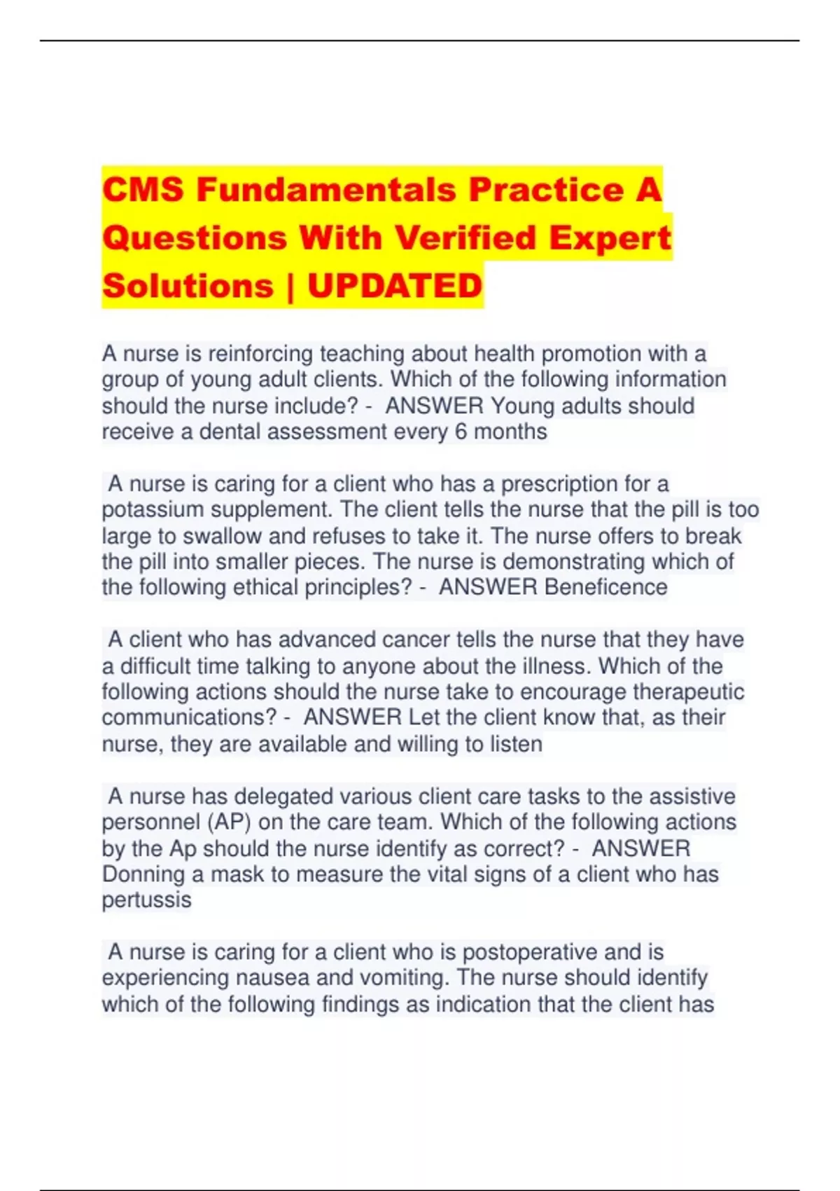 CMS Fundamentals Practice A Questions With Verified Expert Solutions | UPDATED A nurse is reinforcing teaching about health promotion with a group of young adult clients. Which of the following information should the nurse include? - ANSWER Young adults should receive a dental assessment every 6 months A nurse is caring for a client who has a prescription for a potassium supplement. The client tells the nurse that the pill is too large to swallow and refuses to take it. The nurse offers to break the pill into smaller pieces. The nurse is demonstrating which of the following ethical principles? - ANSWER Beneficence A client who has advanced cancer tells the nurse that they have a difficult time talking to anyone about the illness. Which of the following actions should the nurse take to encourage therapeutic communications? - ANSWER Let the client know that, as their nurse, they are available and willing to listen A nurse has delegated various client care tasks to the assistive personnel (AP) on the care team. Which of the following actions by the Ap should the nurse identify as correct? - ANSWER Donning a mask to measure the vital signs of a client who has pertussis A nurse is caring for a client who is postoperative and is experiencing nausea and vomiting. The nurse should identify which of the following findings as indication that the client has fluid volume deficit? (Select all that apply? - ANSWER - cool extremities - orthostatic hypotension - flat neck veins A nurse is taking notes of client information on a piece of paper while receiving report. Which of the following actions should the nurse take to dispose of the paper? - ANSWER Shred the paper in a secure container A nurse is reinforcing teaching with a client about the use of crutches. Which of the following actions by the client indicates an understanding of the teaching? - ANSWER The client advances the unaffected leg first while climbing stairs A nurse is providing wound care for a group of clients. Which of the following wounds should the nurse identify as healing by secondary intention? - ANSWER A stage 3 pressure injury on the coccyx A nurse is preparing to administer a topical medication to a client. Which of the following actions should the nurse take? - ANSWER Compare the label of the medication container with the medication administration record three times A nurse is reinforcing preoperative teaching with a client about how to turn, cough, and deep breathe. Which of the following statements by the client indicates an understanding of the teaching? - ANSWER "This can help prevent pneumonia" A nurse is reinforcing teaching about hospice care measures with the family of a client who is dying. Which of the following statements by a member of the client's family indicates an understanding of the teaching? - ANSWER "We will keep her room cool to help her breathe better." A nurse is planning to perform wound irrigation for a client who has a large abdominal wound. Which of the following actions should the nurse plan to take? - ANSWER Administer an analgesic 30 min before starting the procedure A nurse is planning care for a client for a client who is disorientated and at risk for falls. Which of the following interventions should the nurse include? (Select all that apply) - ANSWER - ensure that the client is wearing nonskid slippers - place the client in a room near the nurses' station - reinforce teaching about how to use the call bell A nurse is caring for a client who has an indwelling urinary catheter. Which of the following actions should the nurse take to prevent urinary tract infections? - ANSWER Drain urine from the tubing before ambulation A nurse is collecting data from a client who has an NG tube set to low intermittent suction. Which of the following findings indicates hypomagnesemia? - ANSWER Positive Chvostek's sign A nurse is using Maslow's hierarchy of needs in assisting with discharge planning for a client. Which of the following activities should the nurse recommend as the priority for this client? - ANSWER Attend an exercise program A nurse is caring for a client who is receiving continuous NG tube feedings. The nurse listens to the client's bowel s