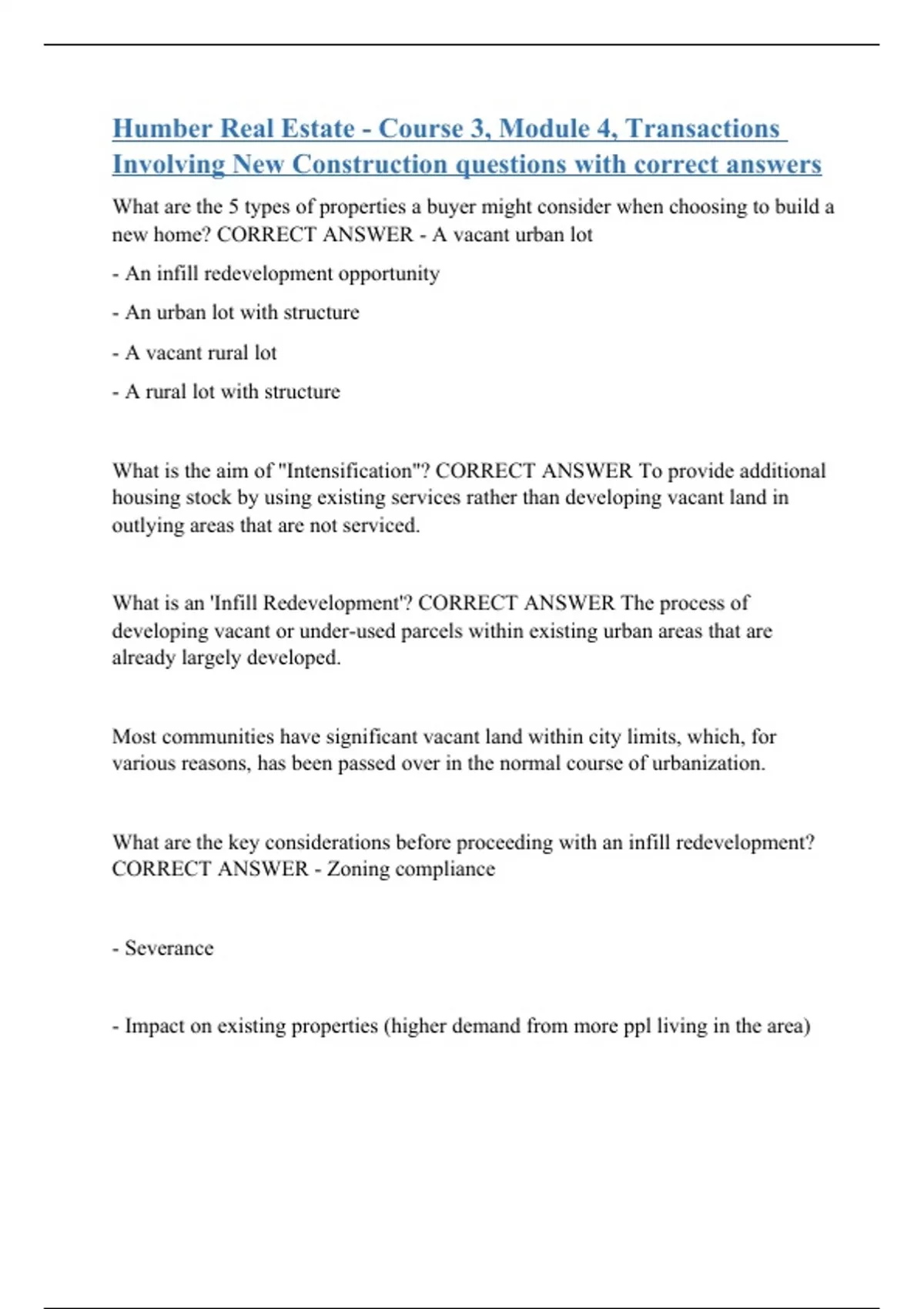 What are the 5 types of properties a buyer might consider when choosing to build a new home? CORRECT ANSWER - A vacant urban lot - An infill redevelopment opportunity - An urban lot with structure - A vacant rural lot - A rural lot with structure What is the aim of "Intensification"? CORRECT ANSWER To provide additional housing stock by using existing services rather than developing vacant land in outlying areas that are not serviced. What is an 'Infill Redevelopment'? CORRECT ANSWER The process of developing vacant or under-used parcels within existing urban areas that are already largely developed. Most communities have significant vacant land within city limits, which, for various reasons, has been passed over in the normal course of urbanization. What are the key considerations before proceeding with an infill redevelopment? CORRECT ANSWER - Zoning compliance - Severance - Impact on existing properties (higher demand from more ppl living in the area)