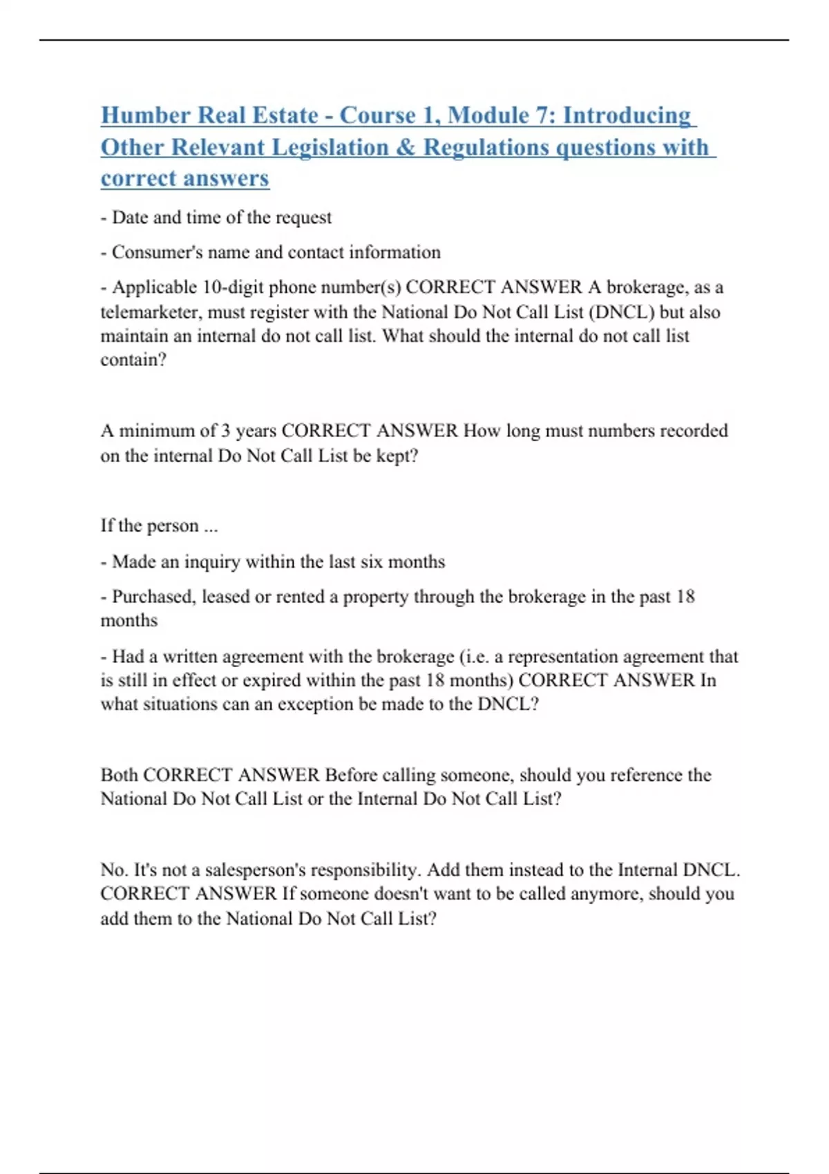 - Date and time of the request - Consumer's name and contact information - Applicable 10-digit phone number(s) CORRECT ANSWER A brokerage, as a telemarketer, must register with the National Do Not Call List (DNCL) but also maintain an internal do not call list. What should the internal do not call list contain? A minimum of 3 years CORRECT ANSWER How long must numbers recorded on the internal Do Not Call List be kept? If the person ... - Made an inquiry within the last six months - Purchased, leased or rented a property through the brokerage in the past 18 months - Had a written agreement with the brokerage (i.e. a representation agreement that is still in effect or expired within the past 18 months) CORRECT ANSWER In what situations can an exception be made to the DNCL? Both CORRECT ANSWER Before calling someone, should you reference the National Do Not Call List or the Internal Do Not Call List? No. It's not a salesperson's responsibility. Add them instead to the Internal DNCL. CORRECT ANSWER If someone doesn't want to be called anymore, should you add them to the National Do Not Call List?