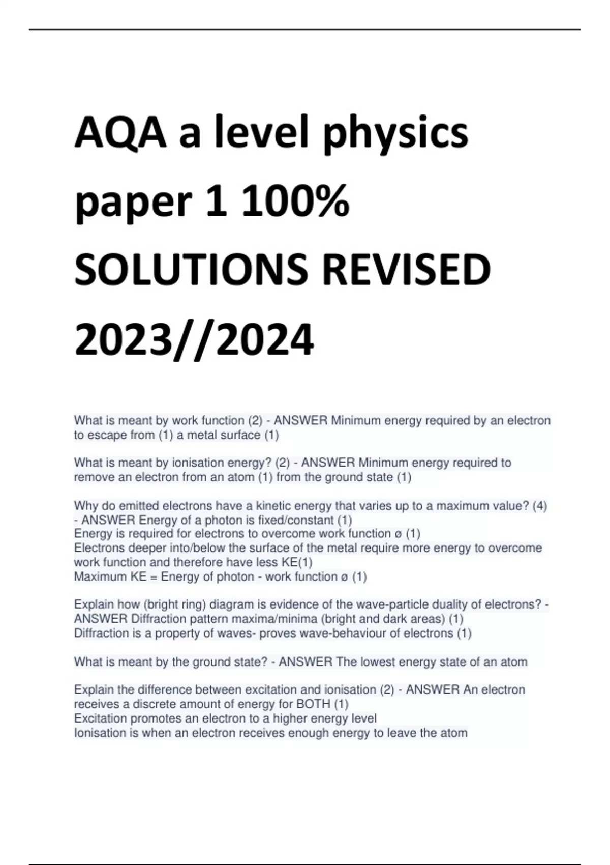 What is meant by work function (2) - ANSWER Minimum energy required by an electron to escape from (1) a metal surface (1) What is meant by ionisation energy? (2) - ANSWER Minimum energy required to remove an electron from an atom (1) from the ground state (1) Why do emitted electrons have a kinetic energy that varies up to a maximum value? (4) - ANSWER Energy of a photon is fixed/constant (1) Energy is required for electrons to overcome work function ø (1) Electrons deeper into/below the surface of the metal require more energy to overcome work function and therefore have less KE(1) Maximum KE = Energy of photon - work function ø (1) Explain how (bright ring) diagram is evidence of the wave-particle duality of electrons? - ANSWER Diffraction pattern maxima/minima (bright and dark areas) (1) Diffraction is a property of waves- proves wave-behaviour of electrons (1) What is meant by the ground state? - ANSWER The lowest energy state of an atom Explain the difference between excitation and ionisation (2) - ANSWER An electron