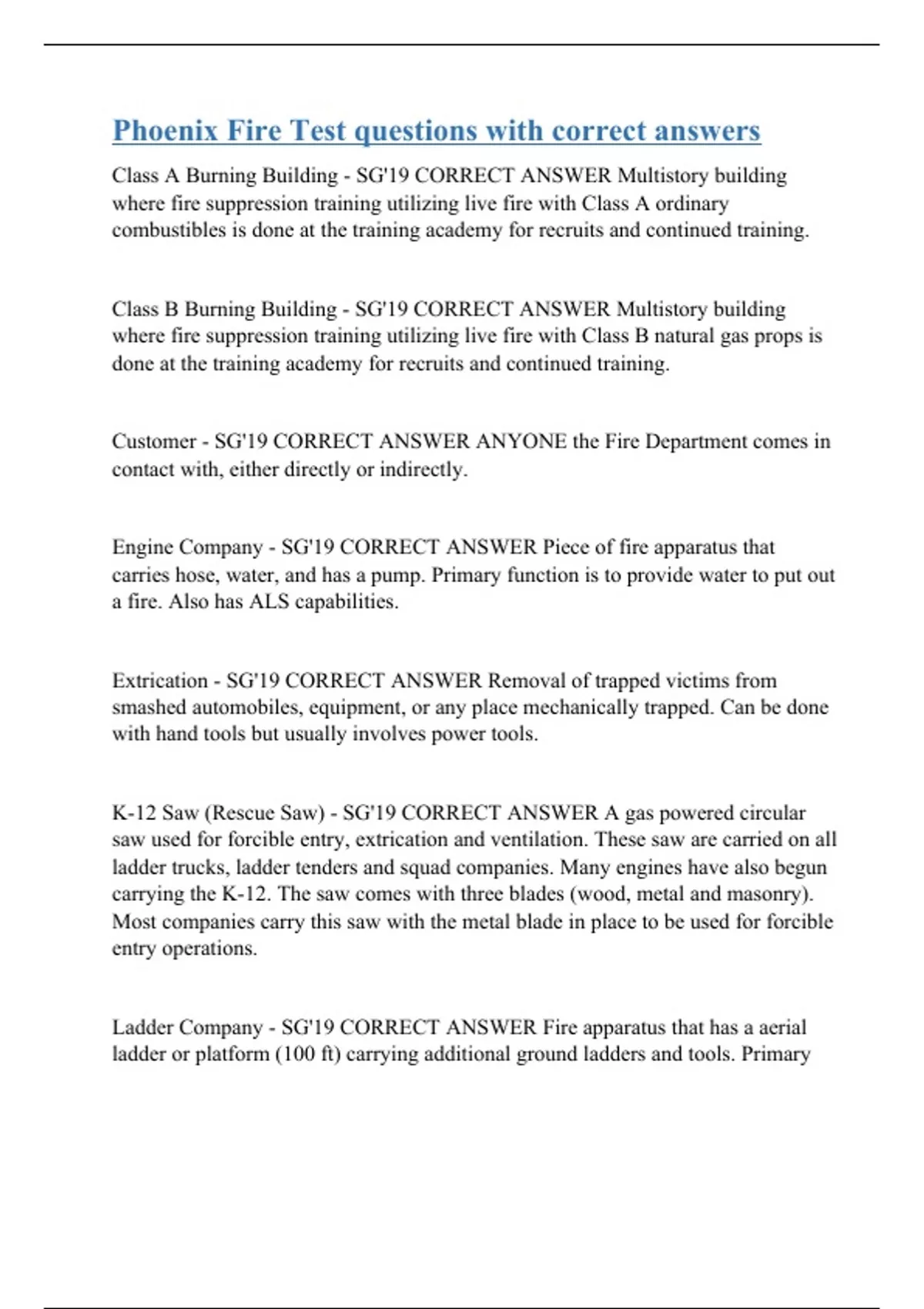 Class A Burning Building - SG'19 CORRECT ANSWER Multistory building where fire suppression training utilizing live fire with Class A ordinary combustibles is done at the training academy for recruits and continued training. Class B Burning Building - SG'19 CORRECT ANSWER Multistory building where fire suppression training utilizing live fire with Class B natural gas props is done at the training academy for recruits and continued training. Customer - SG'19 CORRECT ANSWER ANYONE the Fire Department comes in contact with, either directly or indirectly. Engine Company - SG'19 CORRECT ANSWER Piece of fire apparatus that carries hose, water, and has a pump. Primary function is to provide water to put out a fire. Also has ALS capabilities. Extrication - SG'19 CORRECT ANSWER Removal of trapped victims from smashed automobiles, equipment, or any place mechanically trapped. Can be done with hand tools but usually involves power tools. K-12 Saw (Rescue Saw) - SG'19 CORRECT ANSWER A gas powered circular saw used for forcible entry, extrication and ventilation. These saw are carried on all ladder trucks, ladder tenders and squad companies. Many engines have also begun carrying the K-12. The saw comes with three blades (wood, metal and masonry). Most companies carry this saw with the metal bla