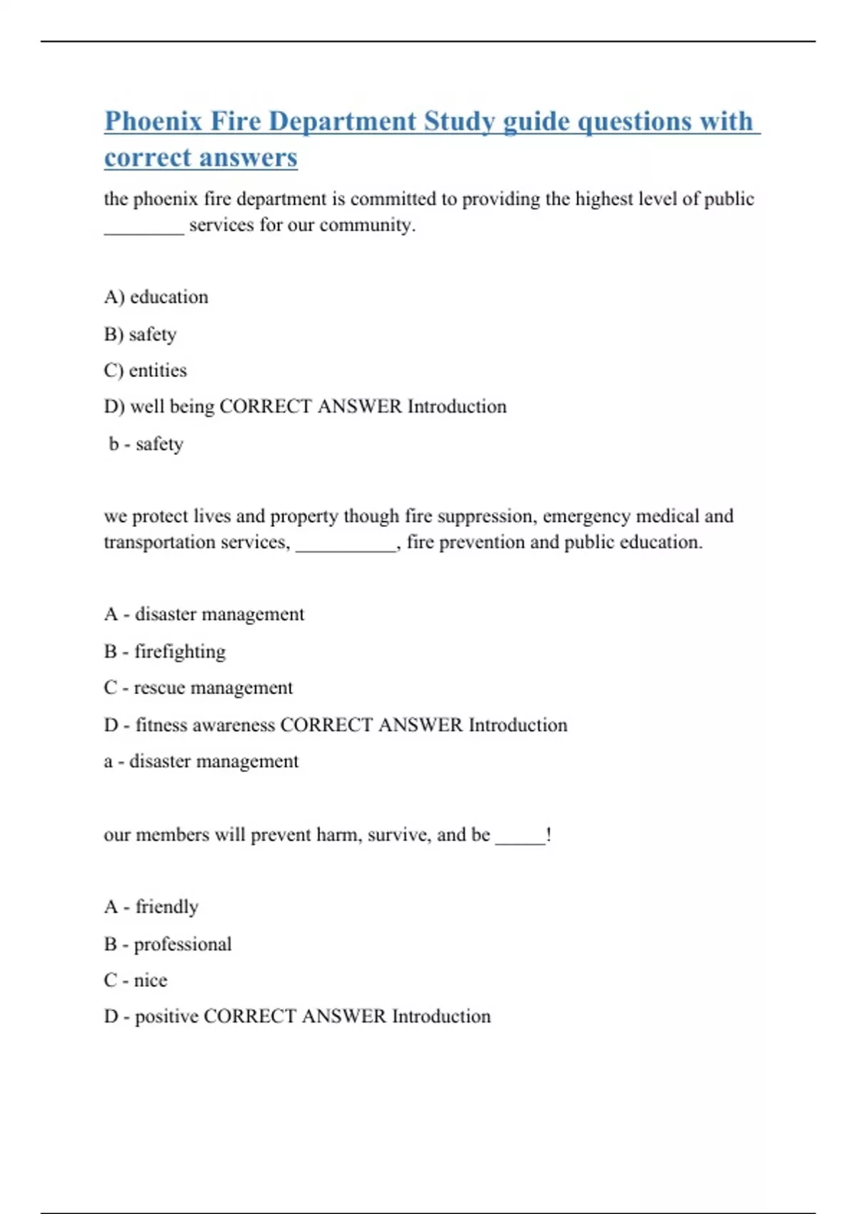 the phoenix fire department is committed to providing the highest level of public ________ services for our community. A) education B) safety C) entities D) well being CORRECT ANSWER Introduction b - safety we protect lives and property though fire suppression, emergency medical and transportation services, __________, fire prevention and public education. A - disaster management B - firefighting C - rescue management D - fitness awareness CORRECT ANSWER Introduction a - disaster management our members will prevent harm, survive, and be _____! A - friendly B - professional C - nice D - positive CORRECT ANSWER Introduct