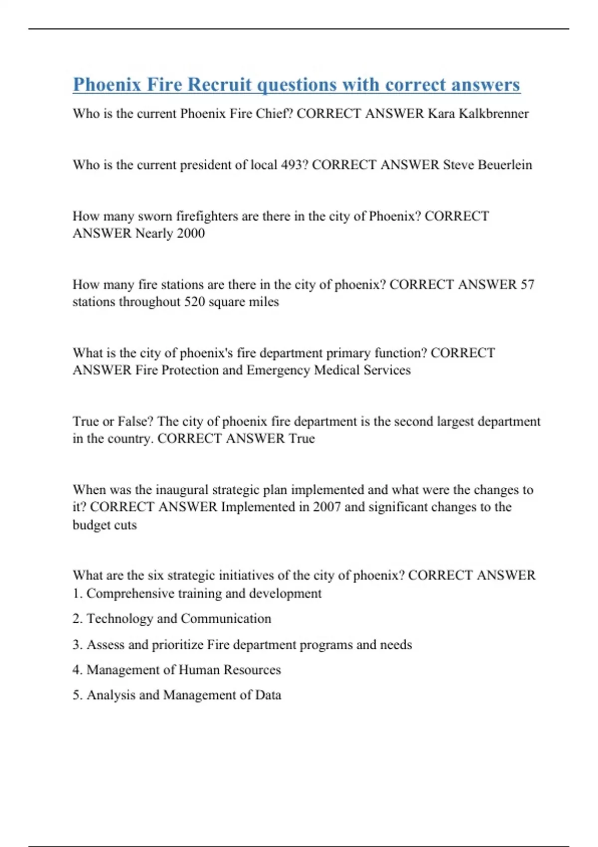 Who is the current Phoenix Fire Chief? CORRECT ANSWER Kara Kalkbrenner Who is the current president of local 493? CORRECT ANSWER Steve Beuerlein How many sworn firefighters are there in the city of Phoenix? CORRECT ANSWER Nearly 2000 How many fire stations are there in the city of phoenix? CORRECT ANSWER 57 stations throughout 520 square miles What is the city of phoenix's fire department primary function? CORRECT ANSWER Fire Protection and Emergency Medical Services True or False? The city of phoenix fire department is the second largest department in the country. CORRECT ANSWER True When was the inaugural strategic plan implemented and what were the changes to it? CORRECT ANSWER Implemented in 2007 and significant changes to the budget cuts What are the six strategic initiatives of the city of phoenix? CORRECT ANSWER 1. Comprehensive training and development 2. Technology and Communication 3. Assess and prioritize Fire department programs and needs 4. Management of Human Resources 5. Analysis and Management of Data