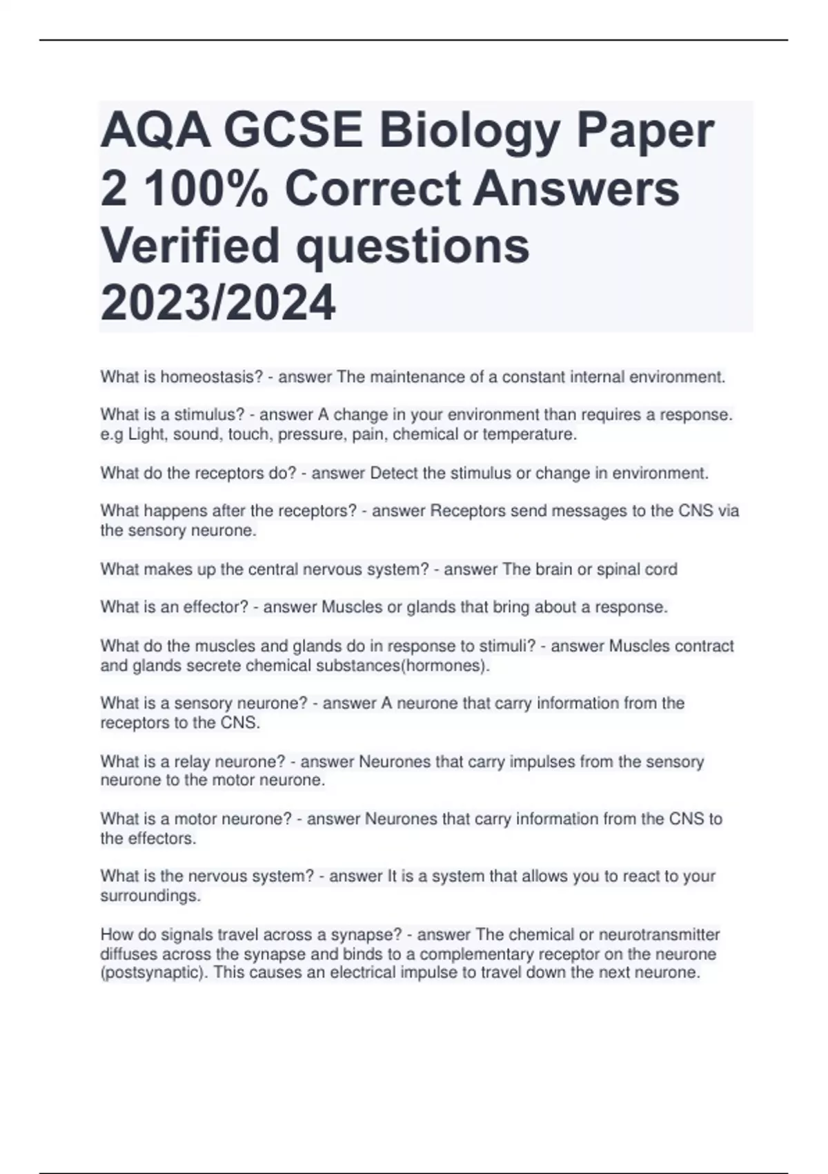 AQA GCSE Biology Paper 2 100% Correct Answers Verified questions 2023/2024