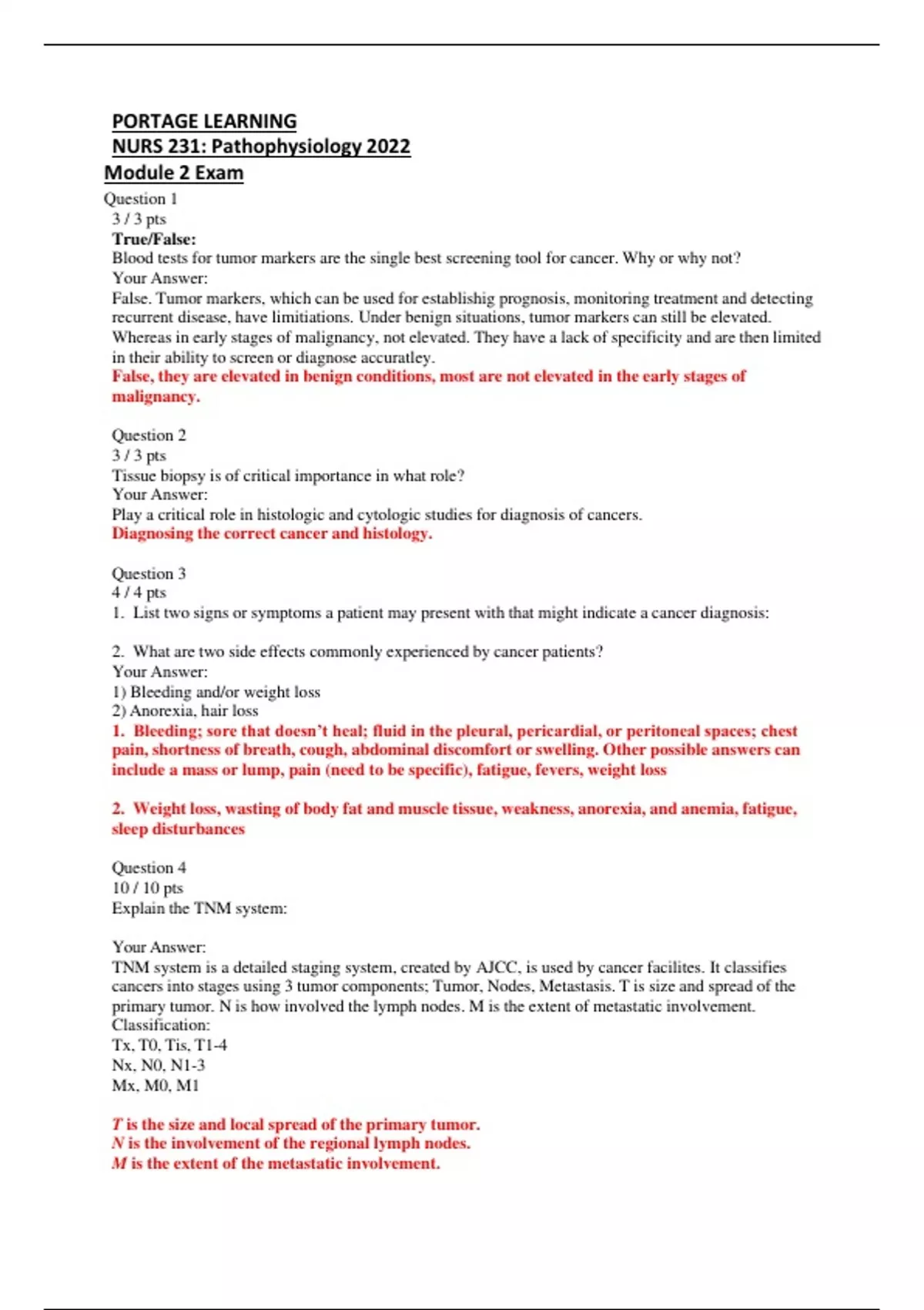 NURS 231: Pathophysiology 2022 Module 2 Exam Question 1 3 / 3 pts True/False: Blood tests for tumor markers are the single best screening tool for cancer. Why or why not? Your Answer: False. Tumor markers, which can be used for establishig prognosis, monitoring treatment and detecting recurrent disease, have limitiations. Under benign situations, tumor markers can still be elevated. Whereas in early stages of malignancy, not elevated. They have a lack of specificity and are then limited in their ability to screen or diagnose accuratley. False, they are elevated in benign conditions, most are not elevated in the early stages of malignancy. Question 2 3 / 3 pts Tissue biopsy is of critical importance in what role? Your Answer: Play a critical role in histologic and cytologic studies for diagnosis of cancers. Diagnosing the correct cancer and histology. Question 3 4 / 4 pts 1. List two signs or symptoms a patient may present with that might indicate a cancer diagnosis: 2. What are two side effects commonly experienced by cancer patients? Your Answer: 1) Bleeding and/or weight loss 2) Anorexia, hair loss 1. Bleeding; sore that doesn’t heal; fluid in the pleural, pericardial, or peritoneal spaces; chest pain, shortness of breath, cough, abdominal discomfort or swelling. Other possible answers can include a mass or lump, pain (need to be specific), fatigue, fevers, weight loss 2. Weight loss, wasting of body fat and muscle tissue, weakness, anorexia, and anemia, fatigue, sleep disturbances Question 4 10 / 10 pts Explain the TNM system: Your Answer: TNM system is a detailed staging system, created by AJCC, is used by cancer facilites. It classifies cancers into stages using 3 tumor components; Tumor, Nodes, Metastasis. T is size and spread of the primary tumor. N is how involved the lymph nodes. M is the extent of metastatic involvement. Classification: Tx, T0, Tis, T1-4 Nx, N0, N1-3 Mx, M0, M1 T is the size and local spread of the primary tumor. N is the involvement of the regional lymph nodes. M is the extent of the metastatic involvement. Question 5 10 / 10 pts 1. When would surgery be appropriate in the treatment of cancer? 2. Most chemotherapeutic drugs cause pancytopenia due to bone marrow suppression. What are the 3 possible adverse outcomes of this? Your Answer: 1. Surgery can be used if the tumor is solid and small with well-defines margins. Also can be used to treat oncologic emergencies and be used as prophylactic measures. 2. 3 possible adverse outcomes are neutropenia, anemia, thrombocytopenia. 1. Surgery is often the first treatment for solid tumors. If the tumor is small with well-defined margins, it can be removed completely. It is also used for oncologic emergencies and prophylactic surgery in high risk patients. 2. Neutropenia- risk for infections Anemia- causing fatigue Thrombocytopenia- risk for bleeding Question 6 2.5 / 2.5 pts True/False: Cell proliferation is the process in which proliferating cells become more specialized cell types. True Correct! False False, cell differentiation Question 7 2.5 / 2.5 pts True/False: Cell differentiation is the process of increasing cell numbers by mitotic cell division. True Correct! False False, cell proliferation Question 8 2.5 / 2.5 pts What are two important properties that stem cells possess? Your Answer: Stem cells possess self-renewal and potency. Self renewal means that they can undergo mitotic divisions while maintaining undifferentiated state. Potency is the differentiation potential of stem cells. Potency and self-renewal Question 9 0 / 2.5 pts Which of the following are most likely to have arisen from an adult stem cell? You Answered Muscle Bone Correct Answer Epithelial Neural Question 10 4 / 4 pts What is angiogenesis? Why do tumors need it? Your Answer: Angiogenesis is the development of new blood vessels within the tumor. In order to continue growing, it must establish blood vessels and growth factors. development of new blood vessels within the tumor. They need it to continue to grow. Question 11 3 / 3 pts What are normal genes called that become cancer-causing if mutated? Your Answer: Proto-oncogenes and Tumor suppressor genes protooncogenes Question 12 1 / 3 pts What is a tumor suppressor gene? Give one example. Your Answer: It is a gene that codes for a protein that inhibits cell growth and signals apoptosis. An example is p53. Tumor suppressor genes are associated with gene underactivity. These genes slow down cell division, repair DNA mistakes, or tell cells when to die. BRCA1 or 2, TP53 Question 13 10 / 10 pts Determine if the tumor is benign or malignant based on the nomenclature: Papilloma Lipoma Leiomyosarcoma Hemangioma Adenocarcinoma Neuroblastoma Adenoma Melanoma Lymphoma Glioma Question 14 10 / 10 pts A 62-year-old man with a 30-pack year smoking history is diagnosed with small cell lung cancer with metastasis to the bone. (1) Explain the process of how cancer spreads metastatically. (2) What symptoms might he have presented with? (3) Which screening test would he have benefited from? Your Answer: 1. Metastasis is a multi-step process. Cancer cells breaks loose from the primary tumor and enters circulation via a blood vessel or lymp system. It finds a new favorable location to invade, grow, and establish blood supply. 2. Patient might have presented with shortness of breath, chest pain, and cough. 3. Patient would have benefited from a chest CT scan. (1) Metastasis- a cancer cell must break loose from the primary tumor, invade the surrounding extracellular matrix, gain access to a blood vessel, survive its passage in the bloodstream, emerge at a favorable location, invade the surrounding tissue, begin to grow, and establish a blood supply. (2) Chest pain, shortness of breath, cough, bone pain. (3) Yearly low-dose chest CT. Question 15 3 / 3 pts Benign tumors have which of the following characteristics? Select all that apply. Undifferentiated cells Correct! Grows by expansion Gains access to blood and lymp