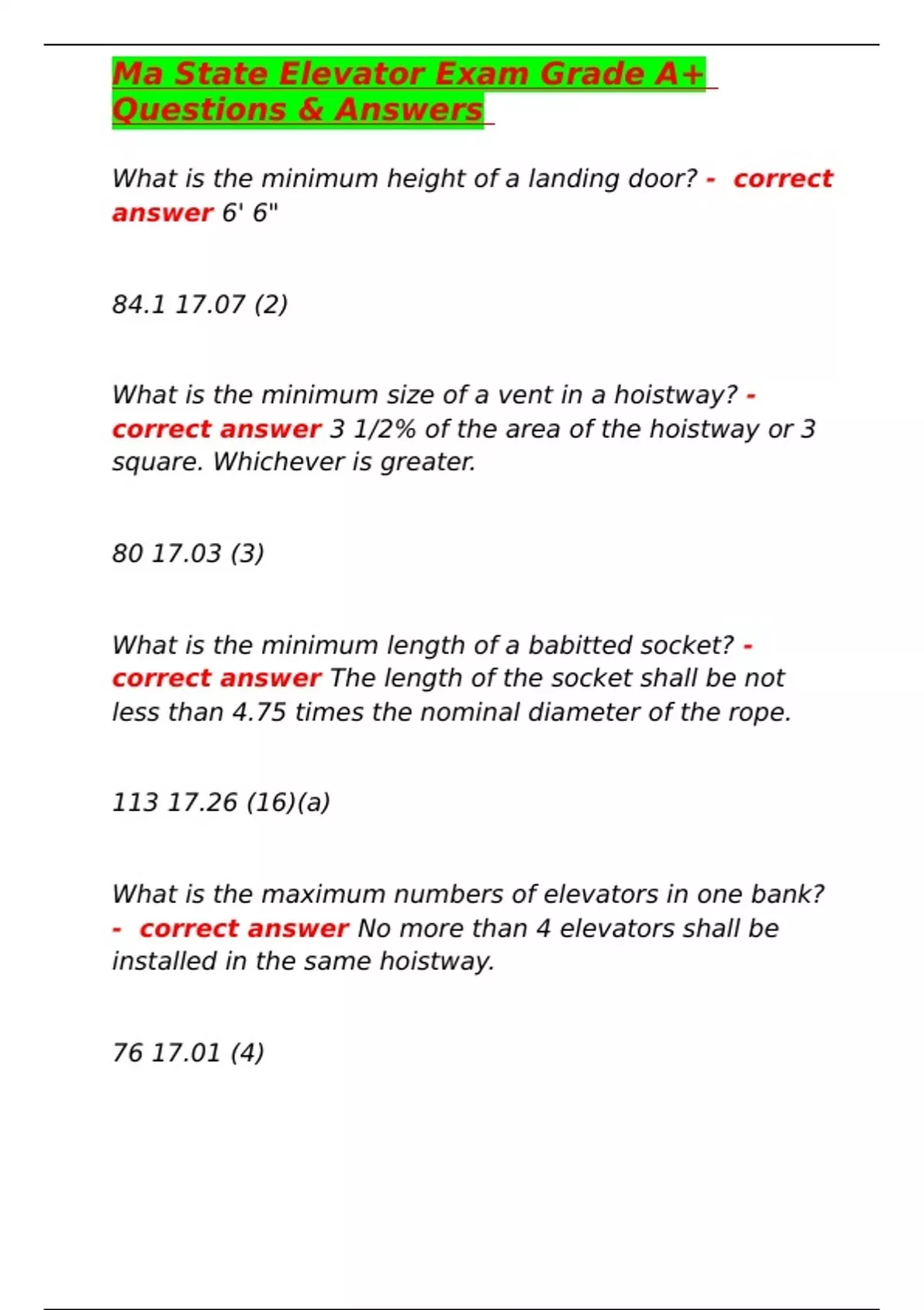 Ma State Elevator Exam Grade A+ Questions & Answers