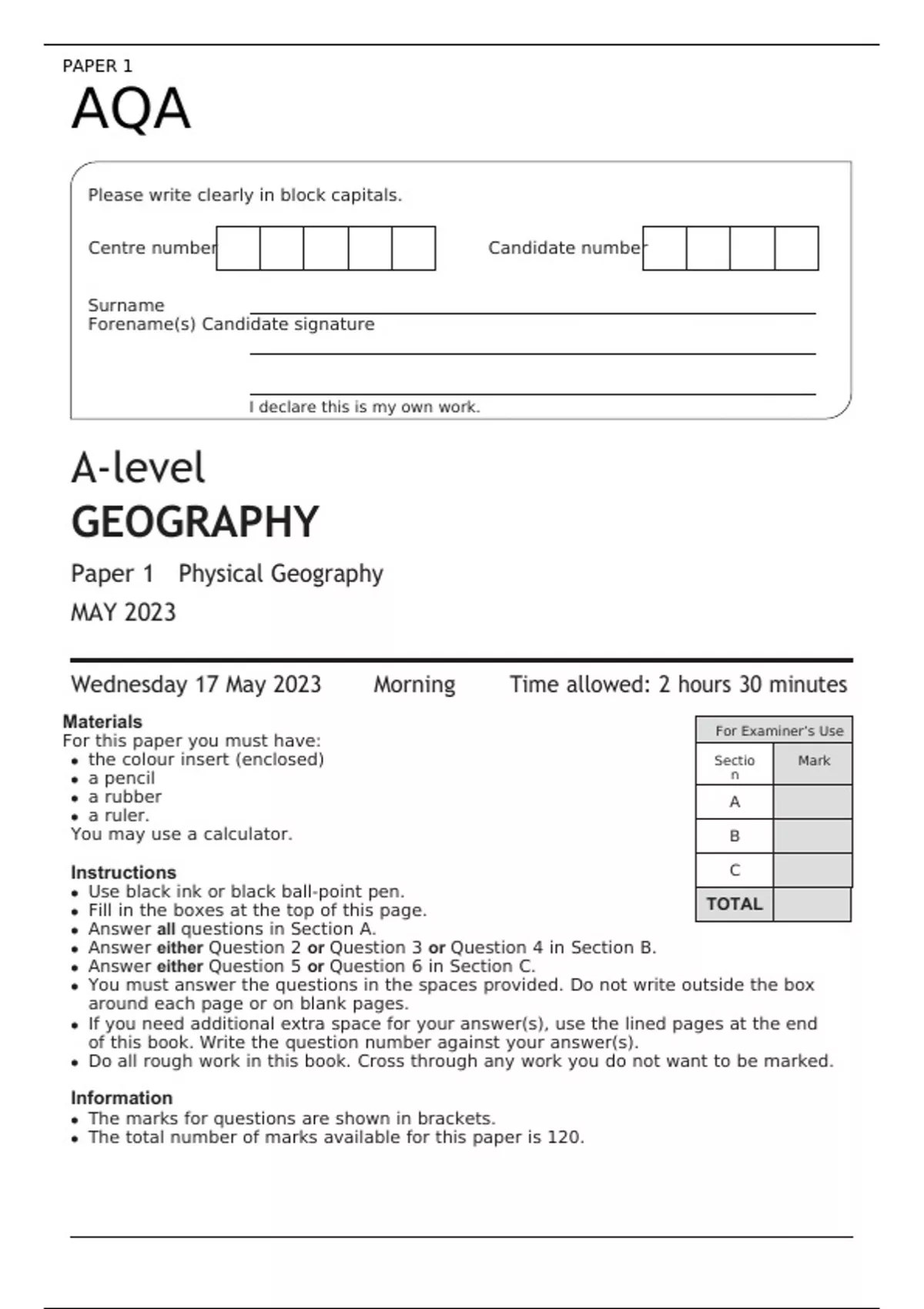 AQA A-level GEOGRAPHY Paper 1 MAY 2023 FINAL QUESTION PAPER Physical Geography