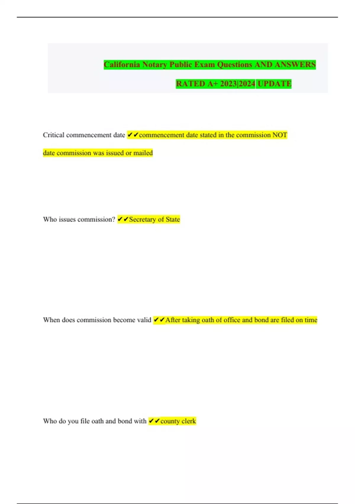 California Notary Public Exam Questions AND ANSWERS RATED A+ 2023|2024 UPDATE