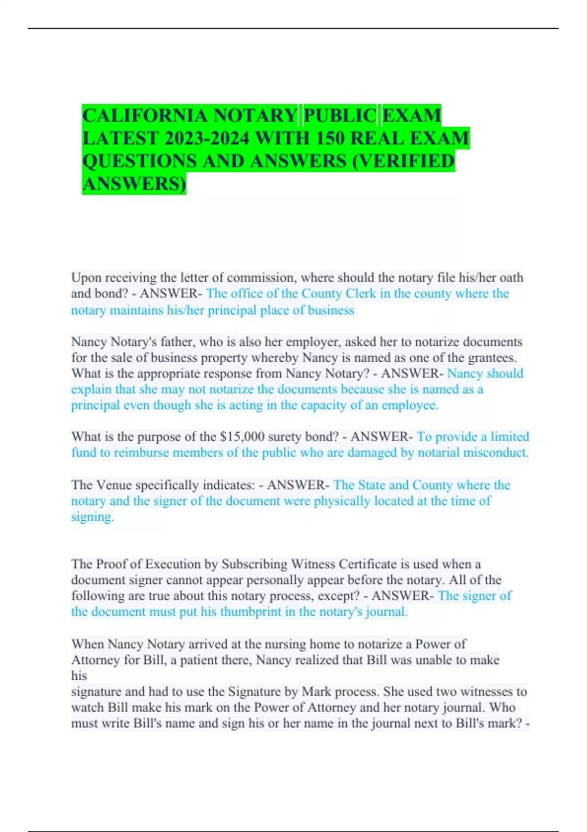 CALIFORNIA NOTARY PUBLIC EXAM LATEST WITH 150 REAL EXAM QUESTIONS AND ANSWERS (VERIFIED ANSWERS)