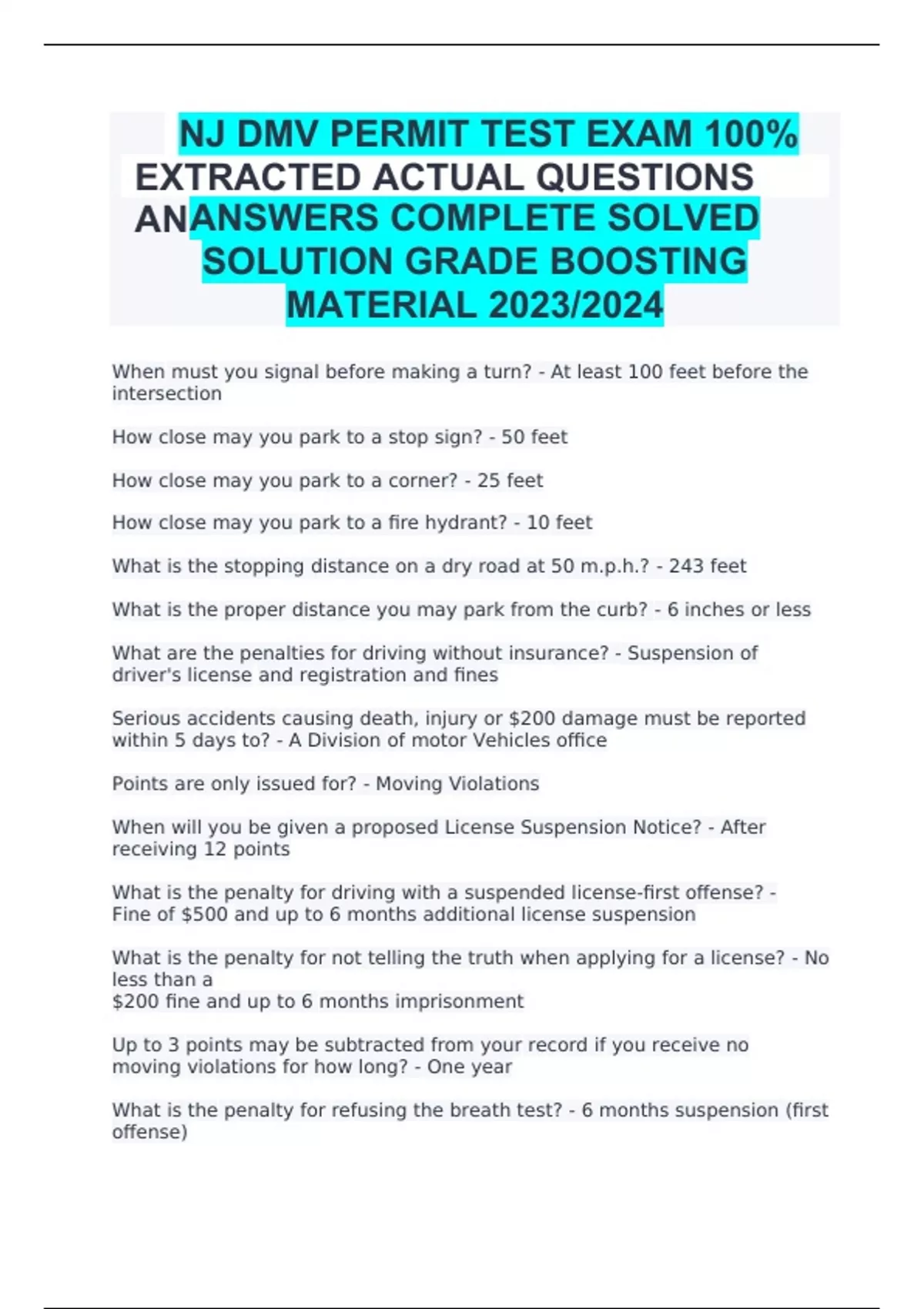 NJ DMV PERMIT TEST EXAM 100% EXTRACTED ACTUAL QUESTIONS AND ANSWERS COMPLETE SOLVED SOLUTION GRADE BOOSTING MATERIAL 2023/2024