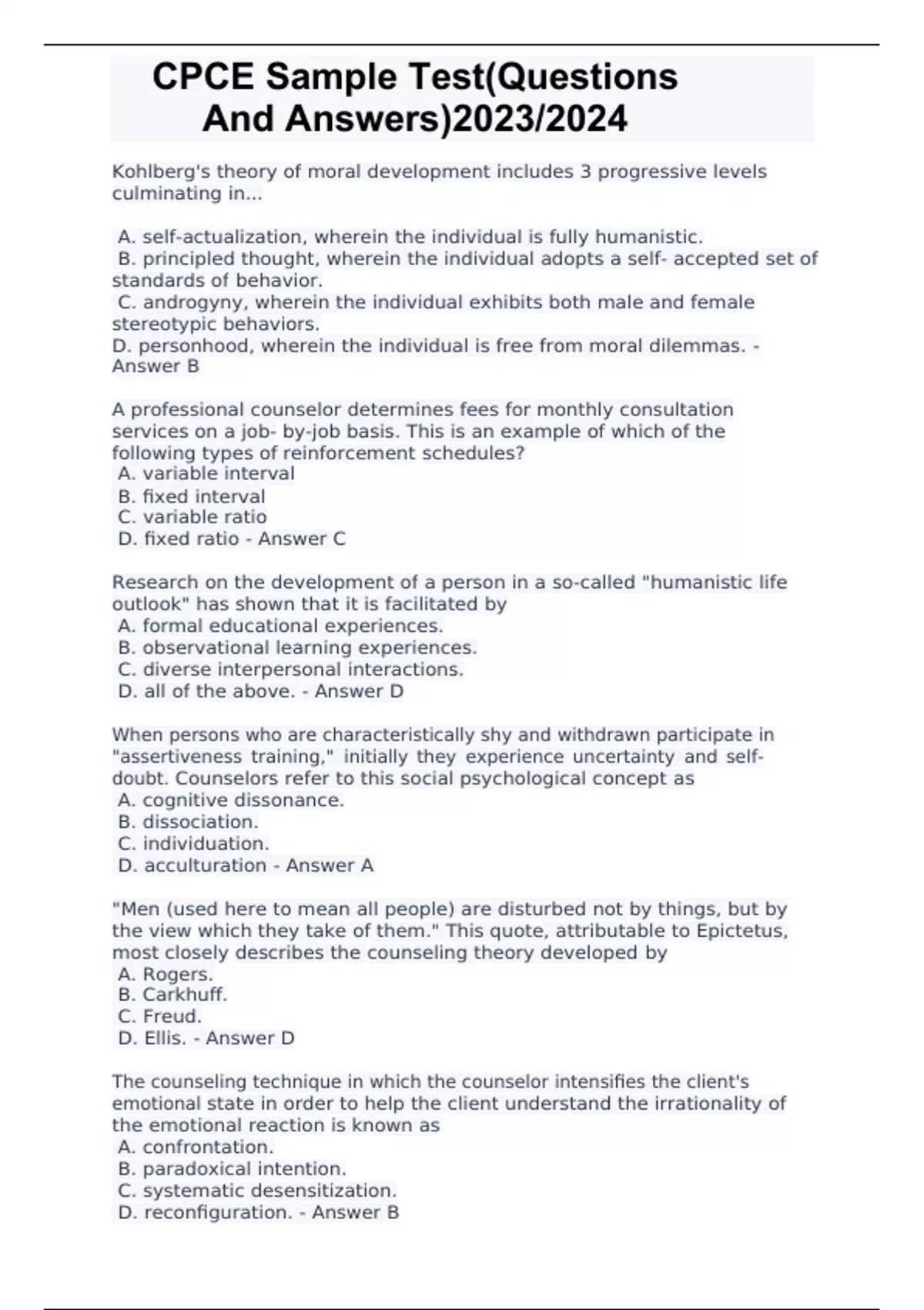 Kohlberg's theory of moral development includes 3 progressive levels culminating in... A. self-actualization, wherein the individual is fully humanistic. B. principled thought, wherein the individual adopts a self- accepted set of standards of behavior. C. androgyny, wherein the individual exhibits both male and female stereotypic behaviors. D. personhood, wherein the individual is free from moral dilemmas. - Answer B