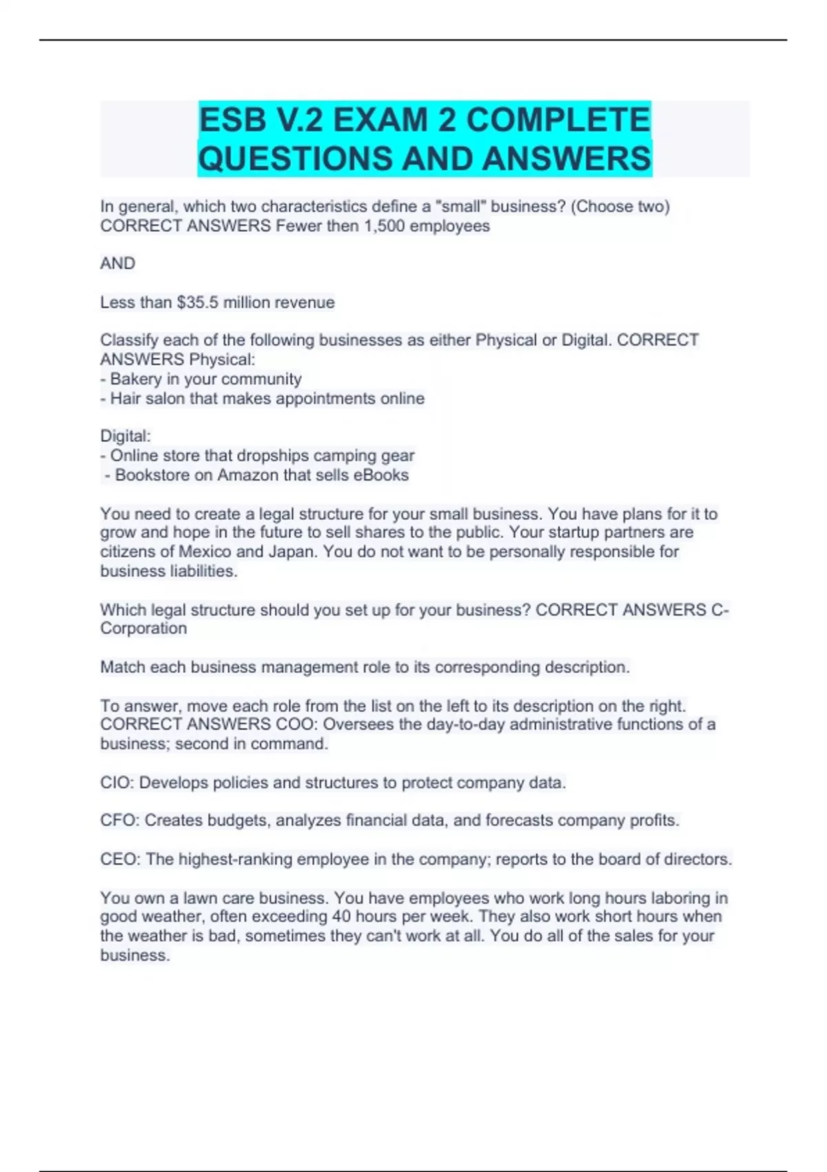 ESB V.2 EXAM 2 COMPLETE QUESTIONS AND ANSWERS