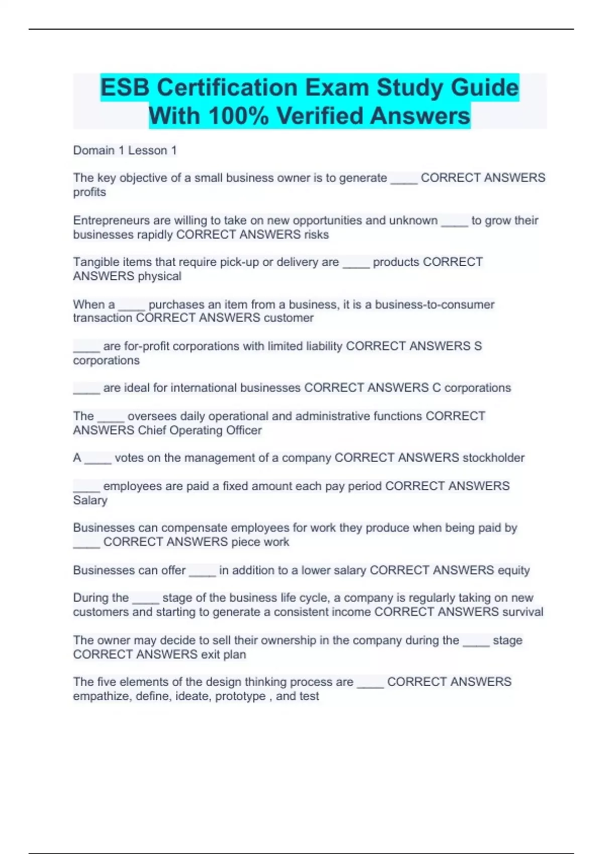 ESB Certification Exam Study Guide With 100% Verified Answers