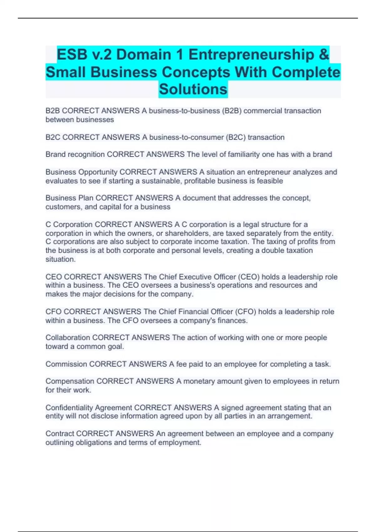 ESB v.2 Domain 1 Entrepreneurship & Small Business Concepts With Complete Solutions