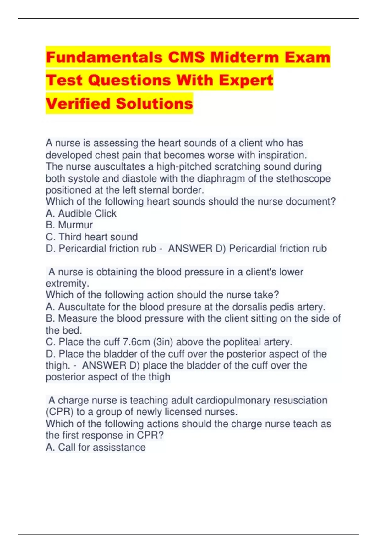 Fundamentals CMS Midterm Exam Test Questions With Expert Verified Solutions A nurse is assessing the heart sounds of a client who has developed chest pain that becomes worse with inspiration. The nurse auscultates a high-pitched scratching sound during both systole and diastole with the diaphragm of the stethoscope positioned at the left sternal border. Which of the following heart sounds should the nurse document? A. Audible Click B. Murmur C. Third heart sound D. Pericardial friction rub - ANSWER D) Pericardial friction rub A nurse is obtaining the blood pressure in a client's lower extremity. Which of the following action should the nurse take? A. Auscultate for the blood presure at the dorsalis pedis artery. B. Measure the blood pressure with the client sitting on the side of the bed. C. Place the cuff 7.6cm (3in) above the popliteal artery. D. Place the bladder of the cuff over the posterior aspect of the thigh. - ANSWER D) place the bladder of the cuff over the posterior aspect of the thigh A charge nurse is teaching adult cardiopulmonary resusciation (CPR) to a group of newly licensed nurses. Which of the following actions should the charge nurse teach as the first response in CPR? A. Call for assisstance B. Begin Chest compressions C. Confirm unresponsiveness. D. Give rescue breaths. - ANSWER C) Confirm unresponsiveness A nurse is caring for a client who requires a chest x-ray. Prior to the client being transported for the procedure, which of the following actions should the nurse take first? A. Explain the x-ray procedure to the client. B. Help the client into a wheelchair before the transporter arrives. C. Ask if the client has any questions. D. Identify the client using two identifiers. - ANSWER D) Identify the client using to identifiers A nurse is caring for a child who is postoperative following a tonsillectomy. Which of the following actions should the nurse take? A. Encourage the child to cough frequently to clear congestion from anesthesia. B. Place a heating pad at the child's neck for comfort. C. Administer analgesics to the child on a routine schedule throughout the day and night. D. Provide the child with ice cream when oral intake is initiated. - ANSWER C) Administer analgesics to the child on a routine schedule throughout the day and night A nurse is providing teaching to a client who has heart failure about how to reduce his daily intake of sodium. Which of the following factors is the most important in determining the client's ability to learn new dietary habits? A. The involvement of the client in planning the change. B. The emphasis the provider places on the dietary changes. C. The learning theory the nurse uses to teach the dietary changes. D. The extent of the dietary changes planned for the client. - ANSWER A) The involvement of the client in planning the change A charge nurse is observing a newly licensed nurse perform tracheostomy care for a client. Which of the following actions by the newly licensed nurse requires intervention? A. Obtaining hydrogen peroxide for the trachesotomy care. B. Obtainging cotton balls for the tracheostomy care. C. Obtaining sterile gloves for the tracheostomy care. D. Obtaining a sterile brush for the tracheostomy care. - ANSWER B) Obtaining cotton balls for the tracheostomy A nurse is preparing to perform mouth care for an unresponsive client. Which of the following actions should the nurse plan to take? A. Place the client supine. B. Keep both side rails up. C. Raise the level of the bed. D. Inspect the client's mouth using a finger sweep. - ANSWER C)