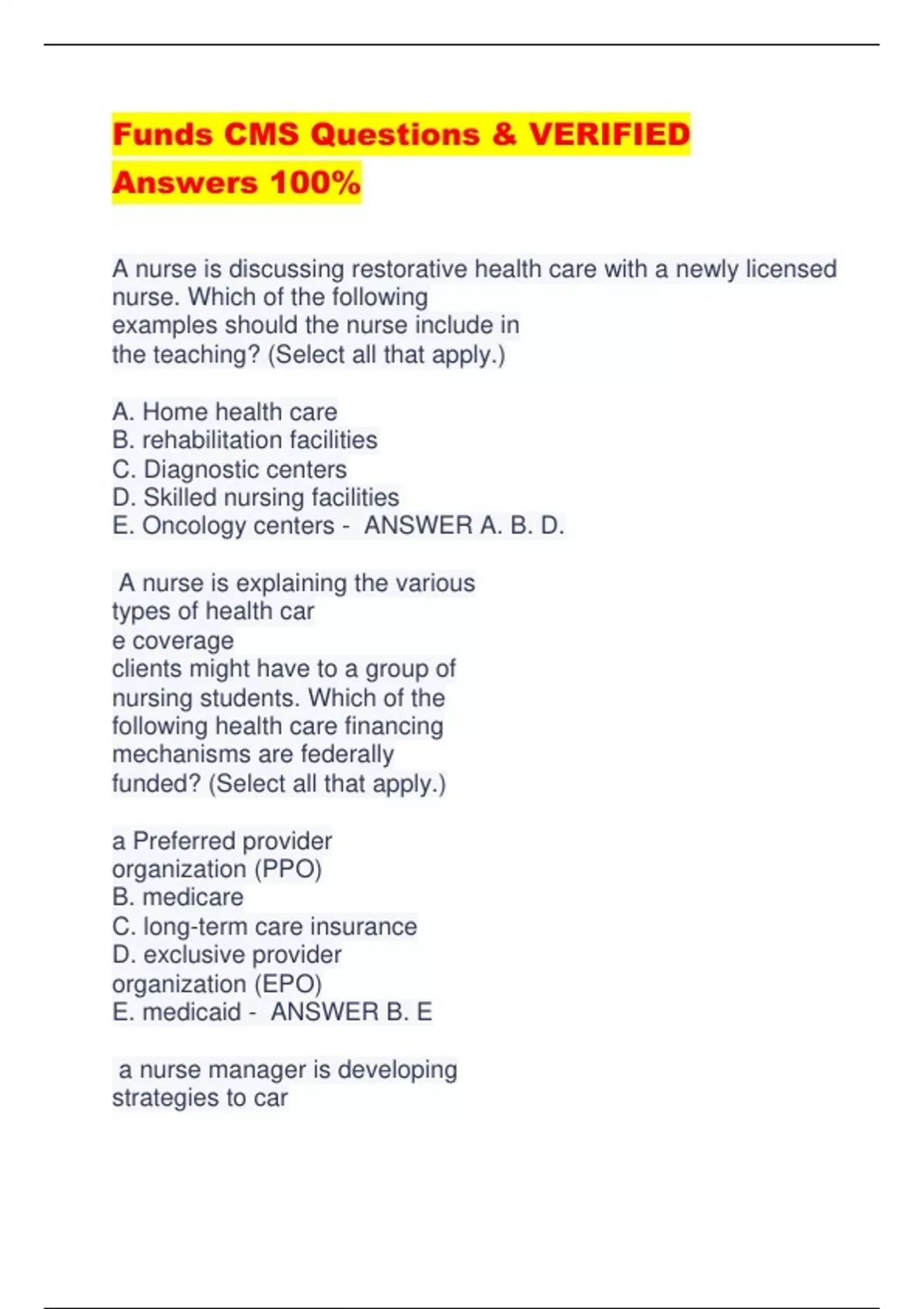 Funds CMS Questions & VERIFIED Answers 100% A nurse is discussing restorative health care with a newly licensed nurse. Which of the following examples should the nurse include in the teaching? (Select all that apply.) A. Home health care B. rehabilitation facilities C. Diagnostic centers D. Skilled nursing facilities E. Oncology centers - ANSWER A. B. D. A nurse is explaining the various types of health car e coverage clients might have to a group of nursing students. Which of the following health care financing mechanisms are federally funded? (Select all that apply.) a Preferred provider organization (PPO) B. medicare C. long-term care insurance D. exclusive provider organization (EPO) E. medicaid - ANSWER B. E a nurse manager is developing strategies to car e for the increasing number of clients who have obesity. Which of the following actions should the nurse include as a primary health care strategy? A. Collaborating with providers to perform obesity screenings during routine office visits B. ensuring the availability of specialized beds in rehabilitation centers for clients who have obesity C. Providing specialized intraoperative training regarding surgical treatments for obesity D. Educating acut - ANSWER A a nurse is discussing the purpose of regulatory agencies during a staff meeting. Which of the following tasks should the nurse identify as the responsibility of state licensing boards? A. monitoring evidence-based practice for clients who have a specific diagnosis B. ensuring that health care providers comply with regulations C. Setting quality standards for accreditation of health care facilities D. Determining if medications are safe for administration to clients - ANSWER B a nurse is explaining the various levels of health car e services to a group of newly licensed nurses. Which of the following examples of care or care settings should the nurse classify as tertiary care? (Select all that apply.) A. intensive care unit B.Oncology treatment center C.Burn center D. Cardiac rehabilitation E. Home health care - ANSWER A. B. C. A nurse is caring for a group of clients on a