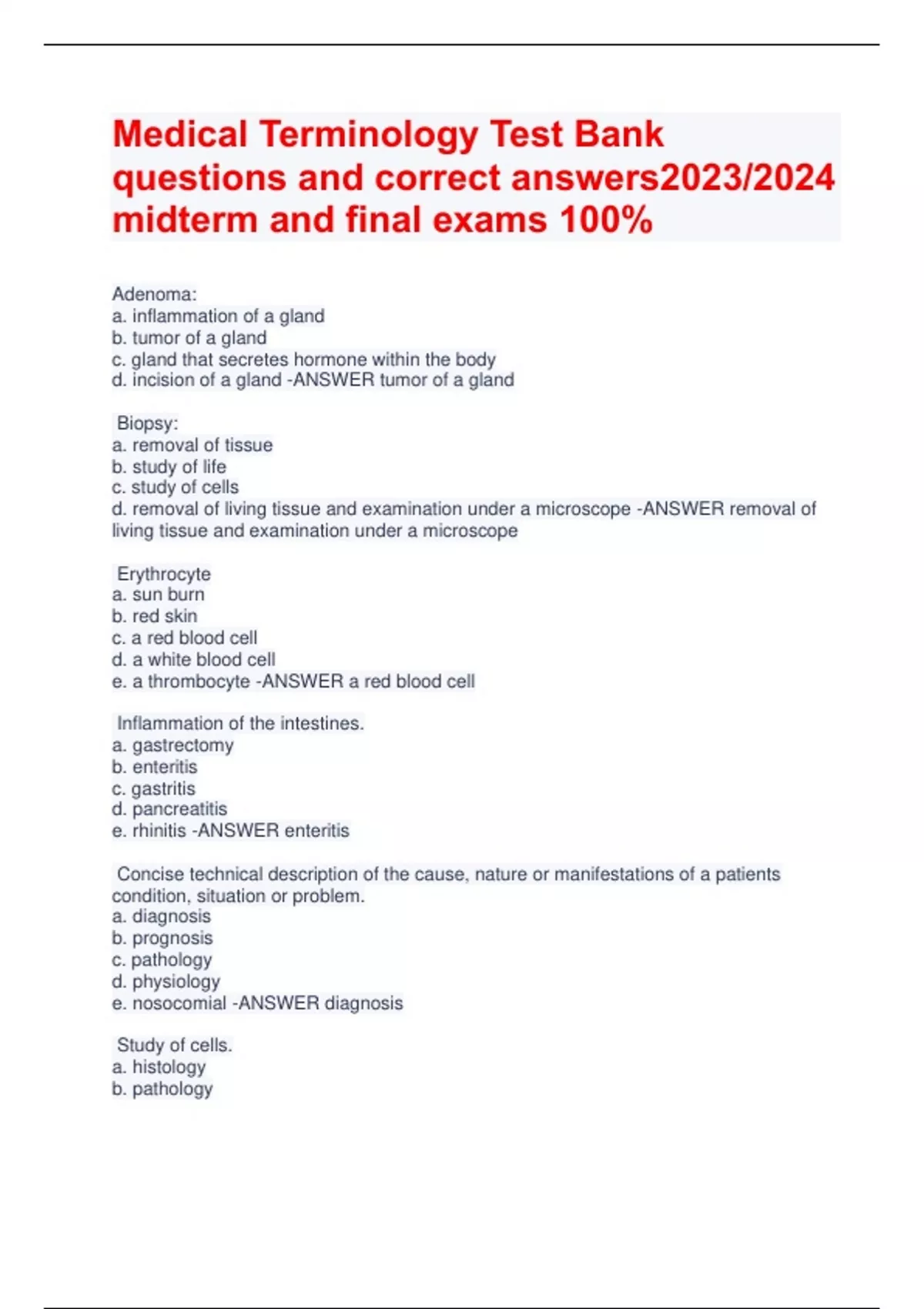 Medical Terminology Test Bank questions and correct answers2023/2024 midterm and final exams 100% Adenoma: a. inflammation of a gland b. tumor of a gland c. gland that secretes hormone within the body d. incision of a gland -ANSWER tumor of a gland Biopsy: a. removal of tissue b. study of life c. study of cells d. removal of living tissue and examination under a microscope -ANSWER removal of living tissue and examination under a microscope Erythrocyte a. sun burn b. red skin c. a red blood cell d. a white blood cell e. a thrombocyte -ANSWER a red blood cell Inflammation of the intestines. a. gastrectomy b. enteritis c. gastritis d. pancreatitis e. rhinitis -ANSWER enteritis Concise technical description of the cause, nature or manifestations of a patients condition, situation or problem. a. diagnosis b. prognosis c. pathology d. physiology e. nosocomial -ANSWER diagnosis Study of cells. a. histology b. pathology c. oncology d. cytology e. hematology -ANSWER cytology Removal of the stomach. a. gastrotomy b. gastralgia c. gastrostomy d. gastritis e. gastrectomy -ANSWER gastrectomy Incision into the stomach. a. gastrotomy b. gastralgia c. gastostorny d. gastritis e. gastrectomy -ANSWER gastrotomy Osteotomy: a. cancerous tumor of cartilage b. study of the skeleton c. pertaining to the joints d. benign tumor of skeletal muscles e. process of cutting into bone -ANSWER process of cutting into bone Hypodermic: a. study of cells b. inflammation of the skin c. pertaining to under the skin d. record of the electricity in the heart e. record of the electricity of the brain -ANSWER pertaining to under the skin Prognosis: a. information gathered about a patient1s illness b. state of before knowledge; prediction about the outcome of an illness c. study of females and female diseases d. study of blood e. pertaining to being produced by treatment -ANSWER state of before knowledge; prediction about the outcome of an illness Oncology: a. study of nerves b. study of tumors c. specialist in the study of tumors d. study of disease e. one who studies diseases, performs autopsies, and examines biopsy samples - ANSWER study of tumors Rhinitis: a. process of cutting out; removal b. a clotting cell c. inflammation of the nose d. tumor of flesh tissue (cancerous tumor of connective tissues, such as bone, muscle, cartilage, fat) -ANSWER inflammation of the nose Leukocyte: a. blood condition of white cells; malignant (cancerous) condition b. white blood cell c. red blood cell d. a white blood cell thrombocyte -ANSWER white blood cell Iatrogenic: a. pertaining to producing cancer b. pertaining to producing disease c. pertaining to adverse condition in a patient by physicians treatment d. pertaining to the stomach -ANSWER pertaining to adverse condition in a patient by physicians treatment Cystitis: a. to cut out, remove b. specialist in the study of female