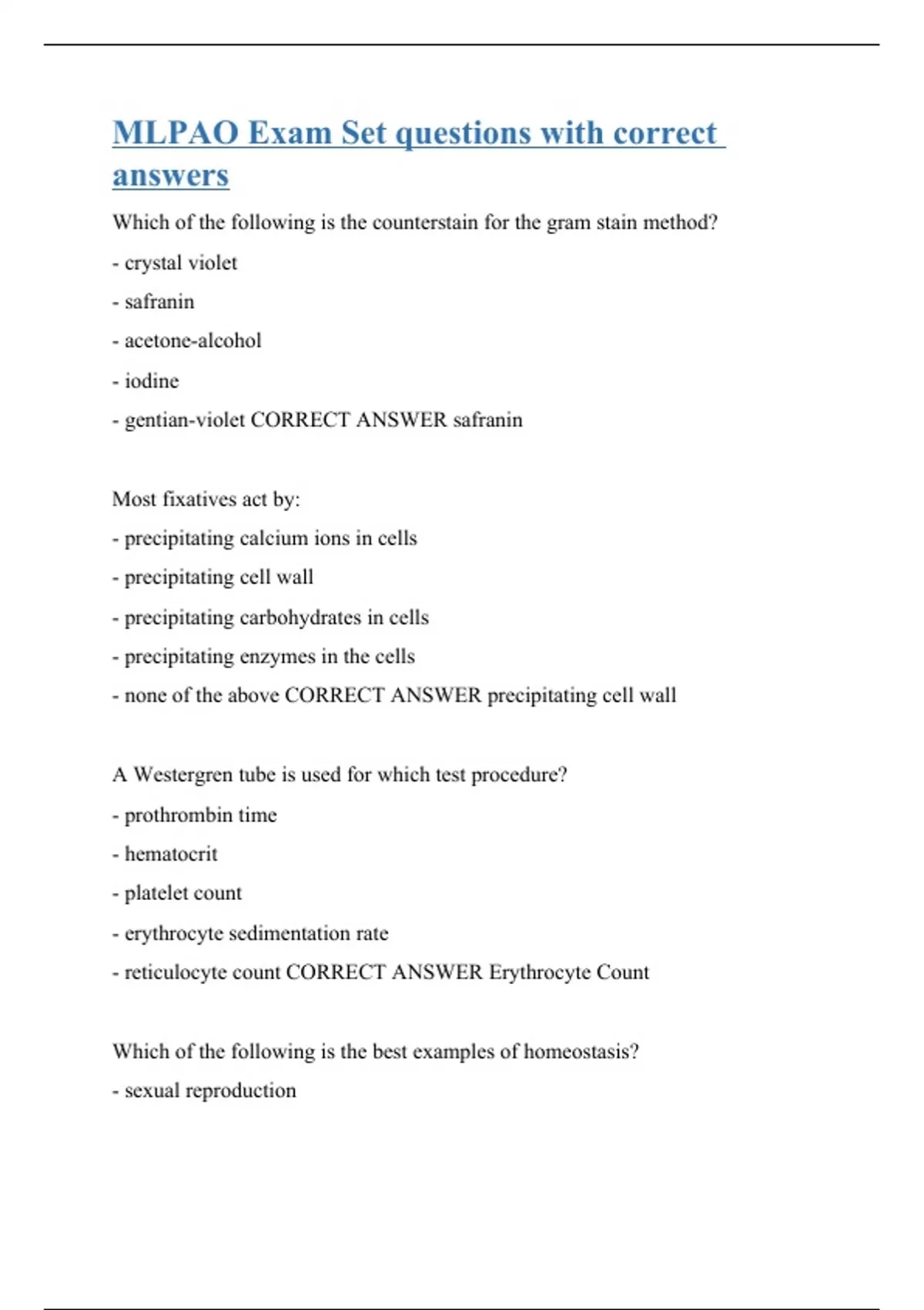 Which of the following is the counterstain for the gram stain method? - crystal violet - safranin - acetone-alcohol - iodine - gentian-violet CORRECT ANSWER safranin Most fixatives act by: - precipitating calcium ions in cells - precipitating cell wall - precipitating carbohydrates in cells - precipitating enzymes in the cells - none of the above CORRECT ANSWER precipitating cell wall A Westergren tube is used for which test procedure? - prothrombin time - hematocrit - platelet count - erythrocyte sedimentation rate - reticulocyte count CORRECT ANSWER Erythrocyte Count Which of the following is the best examples of homeostasis? - sexual reproduction