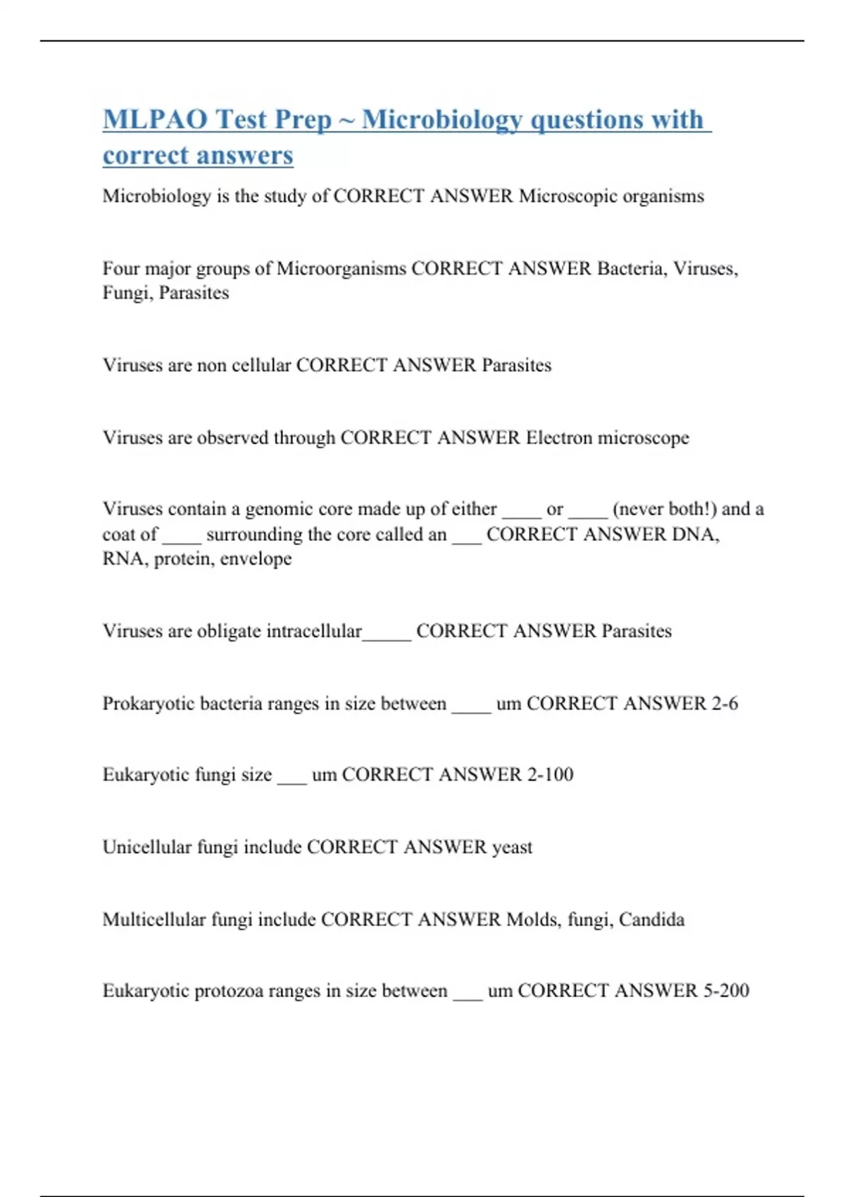 Microbiology is the study of CORRECT ANSWER Microscopic organisms Four major groups of Microorganisms CORRECT ANSWER Bacteria, Viruses, Fungi, Parasites Viruses are non cellular CORRECT ANSWER Parasites Viruses are observed through CORRECT ANSWER Electron microscope Viruses contain a genomic core made up of either ____ or ____ (never both!) and a coat of ____ surrounding the core called an ___ CORRECT ANSWER DNA, RNA, protein, envelope Viruses are obligate intracellular_____ CORRECT ANSWER Parasites Prokaryotic bacteria ranges in size between ____ um CORRECT ANSWER 2-6 Eukaryotic fungi size ___ um CORRECT ANSWER 2-100 Unicellular fungi include CORRECT ANSWER yeast Multicellular fungi include CORRECT ANSWER Molds, fungi, Candida Eukaryotic protozoa ranges in size between ___