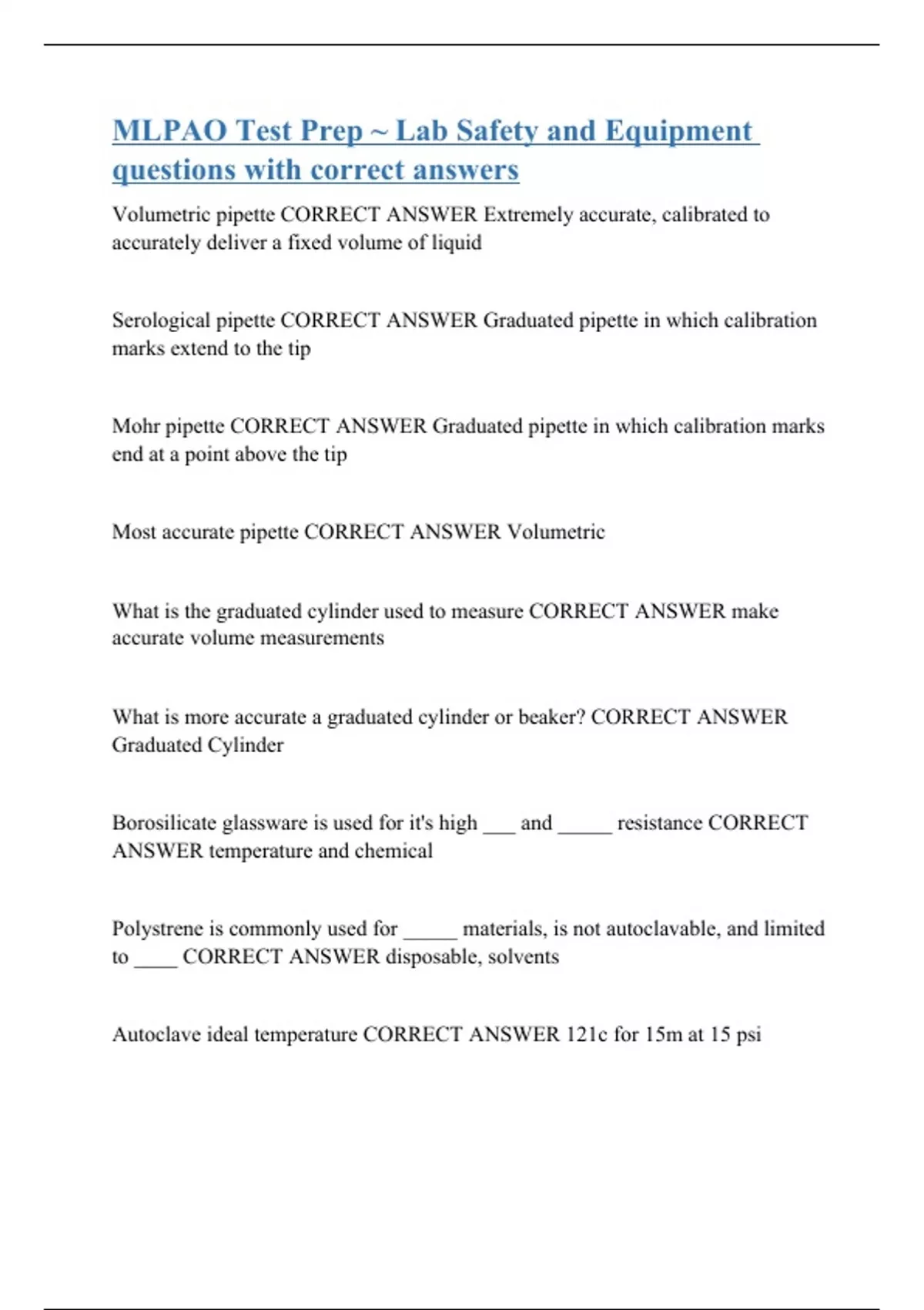 Volumetric pipette CORRECT ANSWER Extremely accurate, calibrated to accurately deliver a fixed volume of liquid Serological pipette CORRECT ANSWER Graduated pipette in which calibration marks extend to the tip Mohr pipette CORRECT ANSWER Graduated pipette in which calibration marks end at a point above the tip Most accurate pipette CORRECT ANSWER Volumetric What is the graduated cylinder used to measure CORRECT ANSWER make accurate volume measurements What is more accurate a graduated cylinder or beaker? CORRECT ANSWER Graduated Cylinder Borosilicate glassware is used for it's high ___ and _____ resistance CORRECT ANSWER temperature and chemical