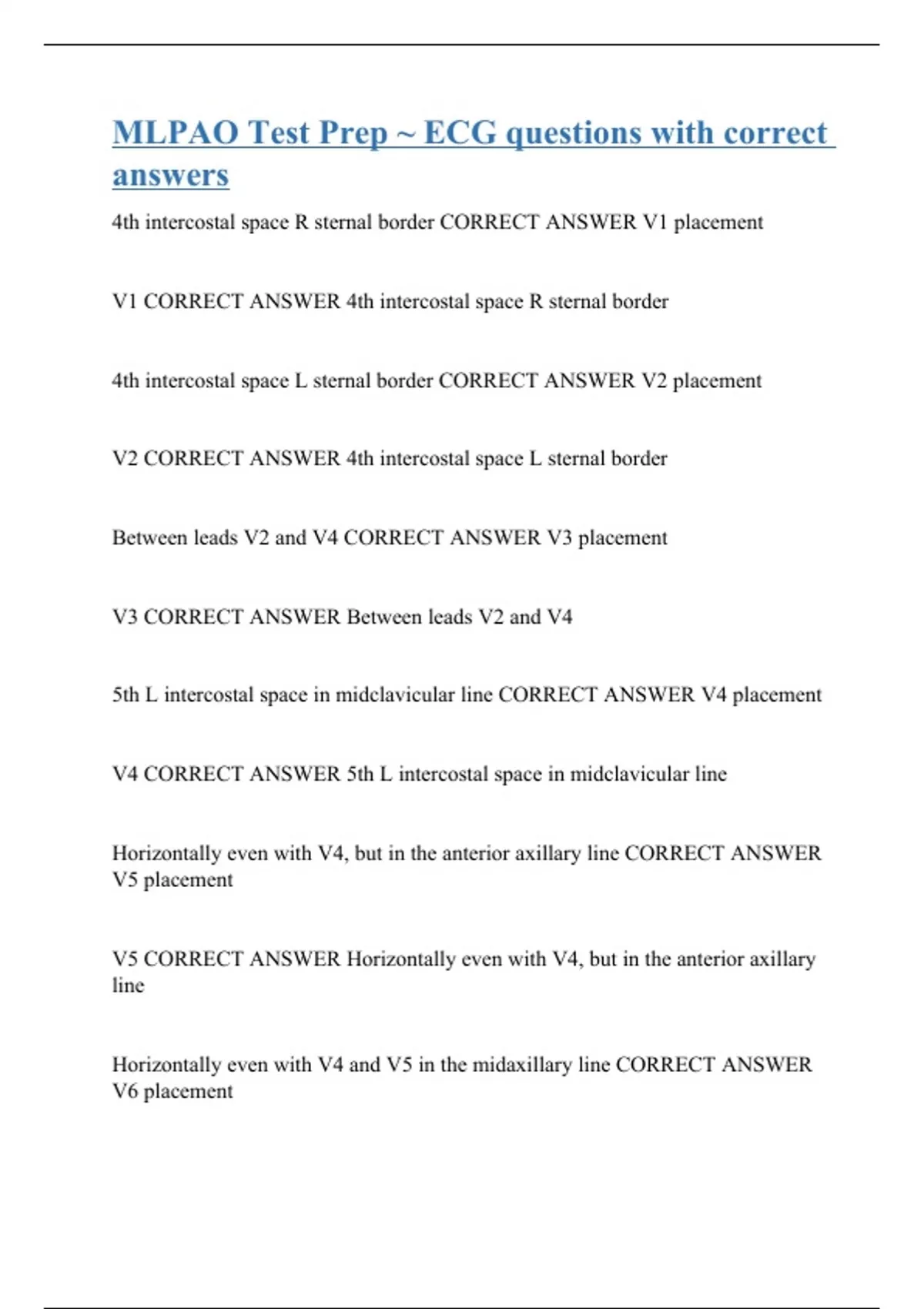 4th intercostal space R sternal border CORRECT ANSWER V1 placement V1 CORRECT ANSWER 4th intercostal space R sternal border 4th intercostal space L sternal border CORRECT ANSWER V2 placement V2 CORRECT ANSWER 4th intercostal space L sternal border Between leads V2 and V4 CORRECT ANSWER V3 placement V3 CORRECT ANSWER Between leads V2 and V4 5th L intercostal space in midclavicular line CORRECT ANSWER V4 placement V4 CORRECT ANSWER 5th L intercostal space in midclavicular line Horizontally even with V4, but in the anterior axillary line CORRECT ANSWER V5 placement V5 CORRECT ANSWER Horizontally ev